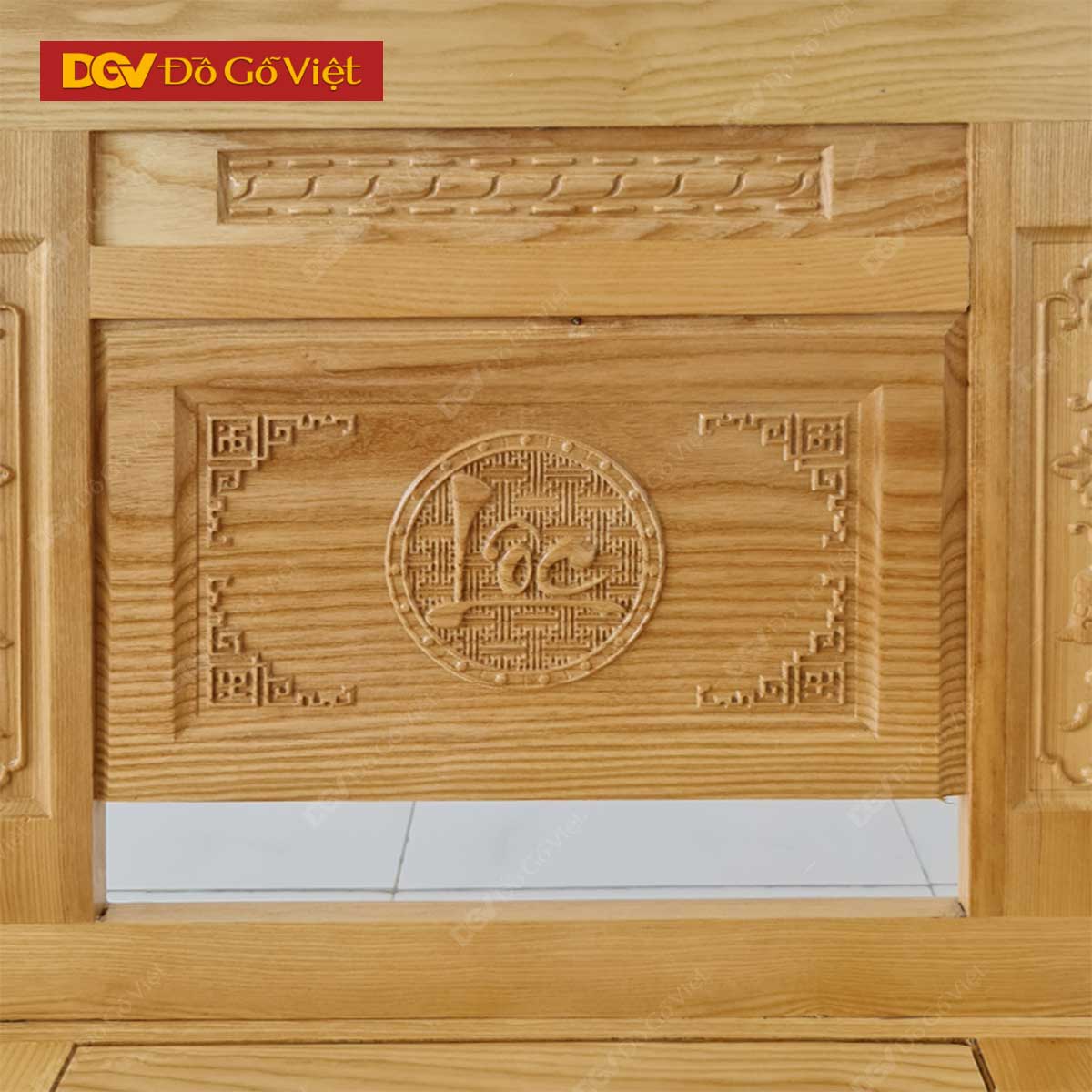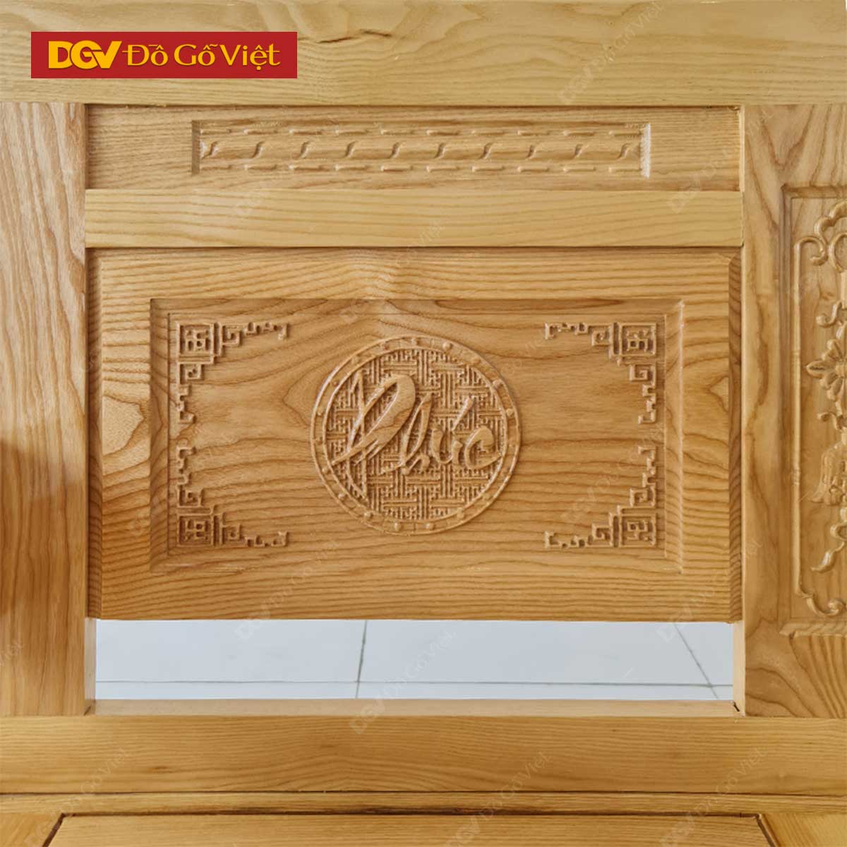 • Lưng ghế chạm thư pháp Phúc, Lộc, Thọ, Phú, Quý với những đường nét uyển chuyển, các nét chữ uốn lượn đẹp mắt ấn tượng đầy nổi bật như được vẽ trên giấy. Các nét chữ thư pháp vừa có tác dụng trang trí, vừa biểu trưng cho ý nghĩa phong thủy, cầu chúc những điều may mắn, hạnh phúc, bình an & trường thọ cho gia chủ.