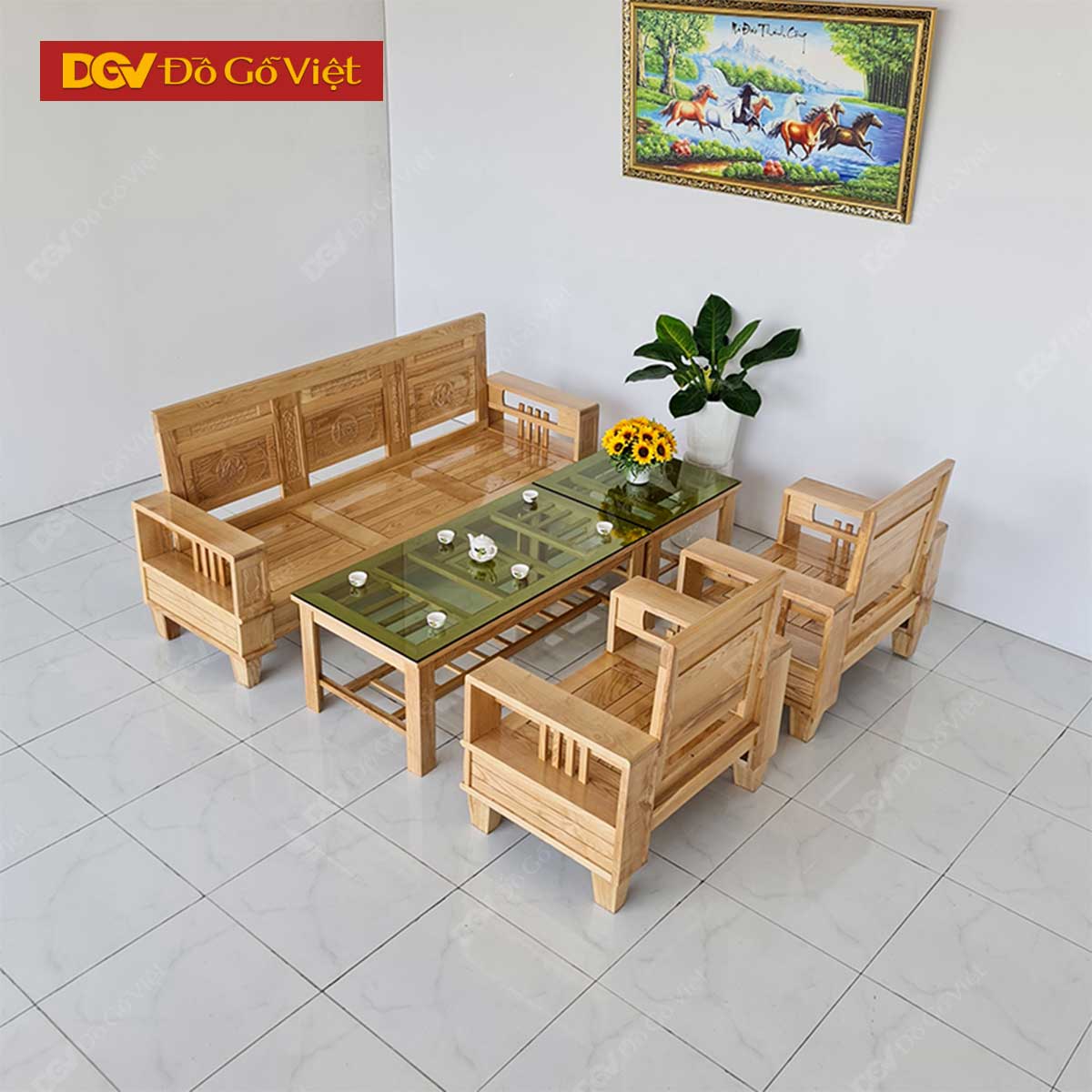 • Bộ sofa gỗ phòng khách gồm 1 bàn trà, 1 băng ghế dài, 2 ghế đơn, 1 bàn nách nhỏ để kéo dài diện tích mặt bàn hoặc để đồ trang trí. Với kích thước bề mặt rộng rãi, có chiều sâu lớn, mang lại sự tiện lợi, thoải mái cho khách hàng khi sử dụng. Trọn bộ sản phẩm có kích thước bài trí 210 x 240cm, phù hợp với những phòng khách nhỏ có diện tích từ 10 -15m2.