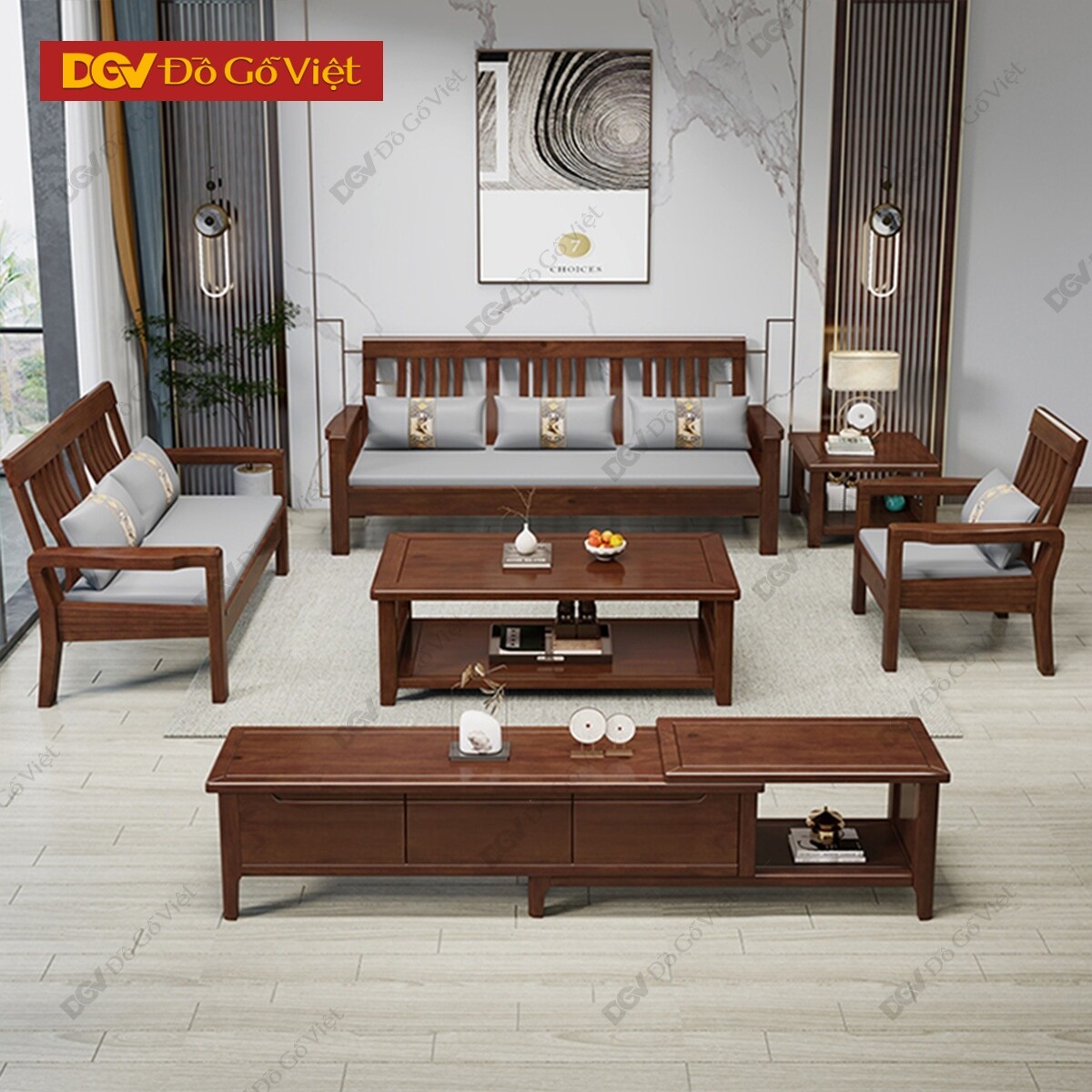 Bộ Sofa Đối Hiện Đại Gỗ Căm Xe Tự Nhiên 5 Món Đơn Giản Đẹp