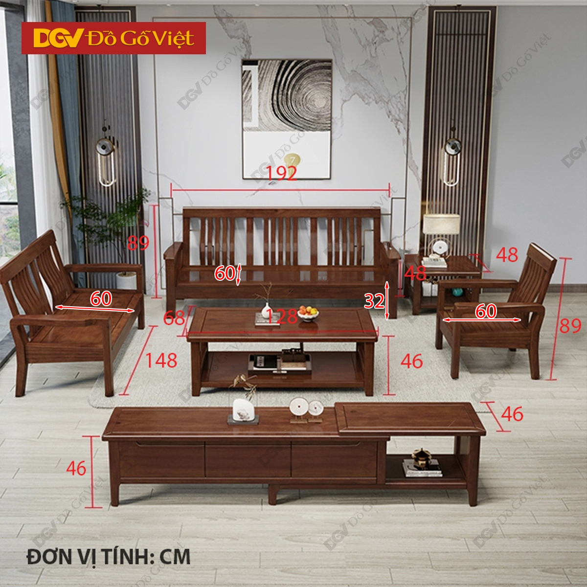 • Bàn trà: Dài 128cm x Rộng 68cm x Cao 48cm.
