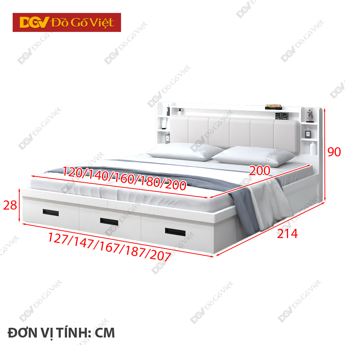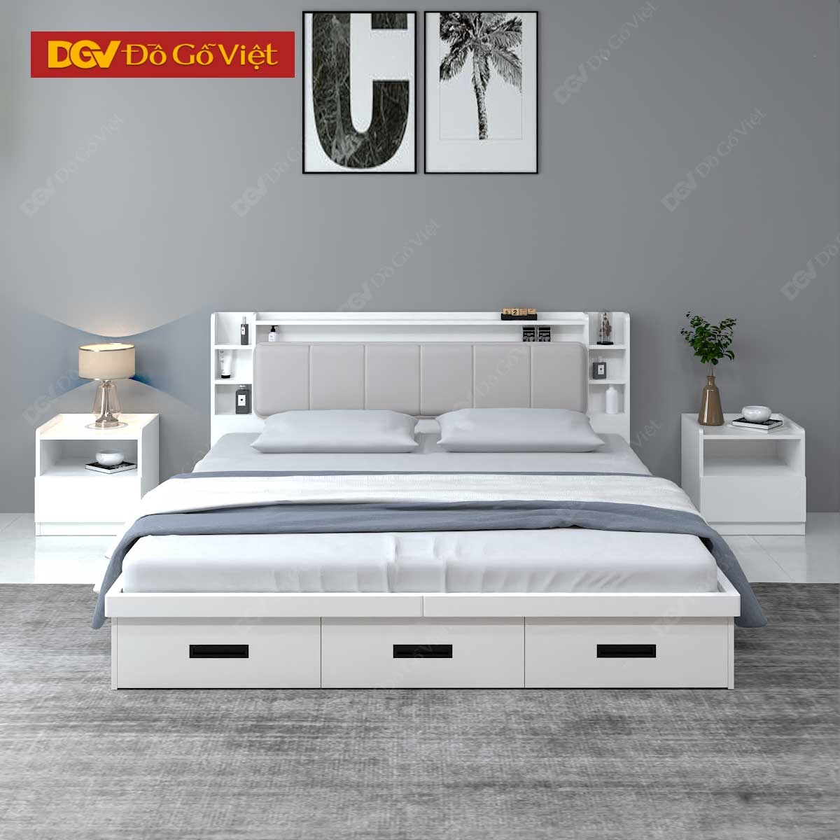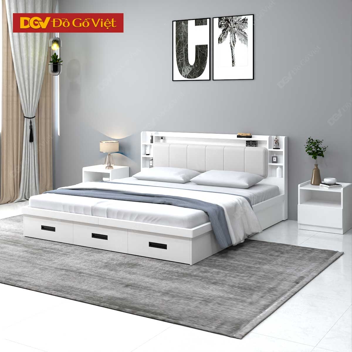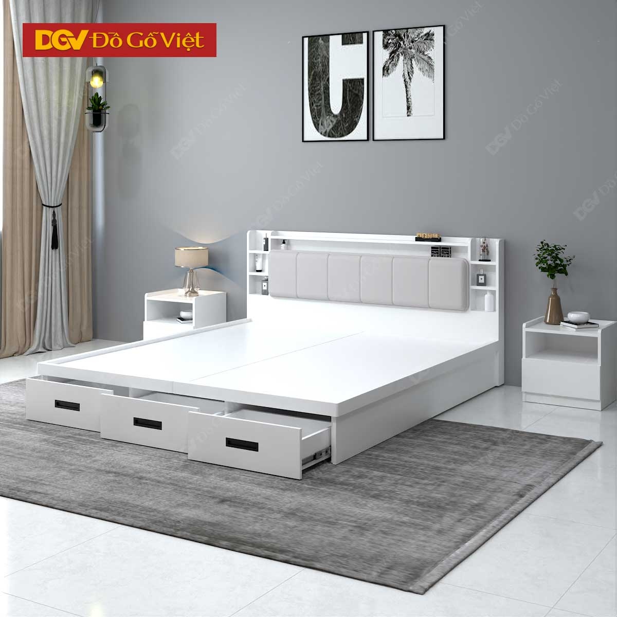 Giường Gỗ Công Nghiệp Màu Trắng 3 Ngăn Kéo Đuôi Lớn