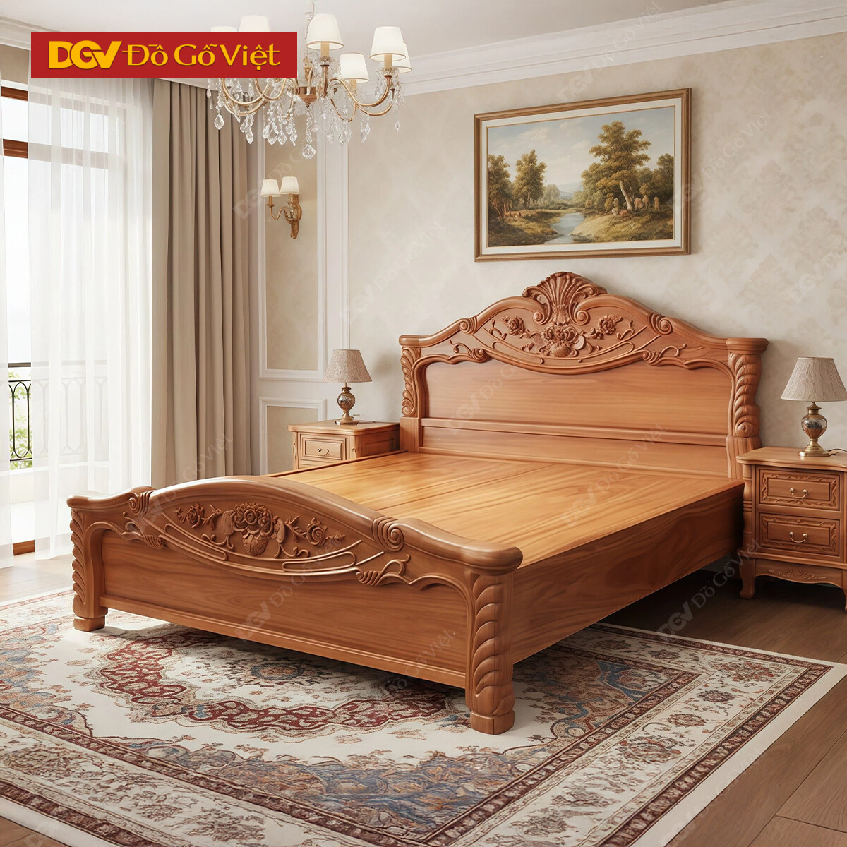 Giường Gõ Đỏ Nữ Hoàng Chạm Hoa Lá Tây Mềm Mại Đối Xứng