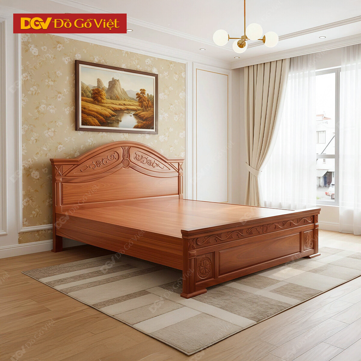 Giường Xoan Đào Đầu Vòm Pano Chạm Hoa Tân Cổ Điển