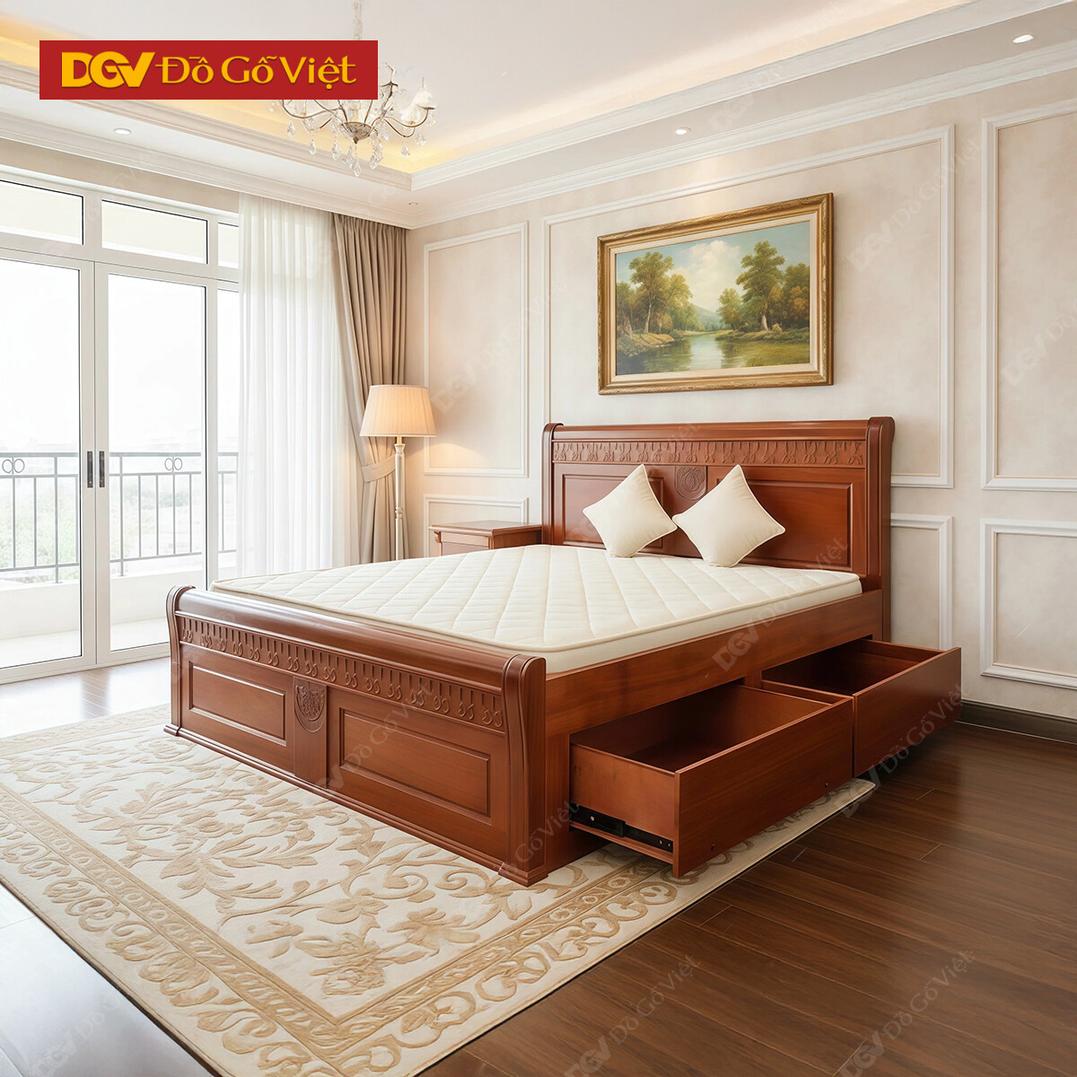 Giường Gỗ Xoan Đào Đầu Pano Chạm Hoa Kèm Hộc Kéo Tiện Ích