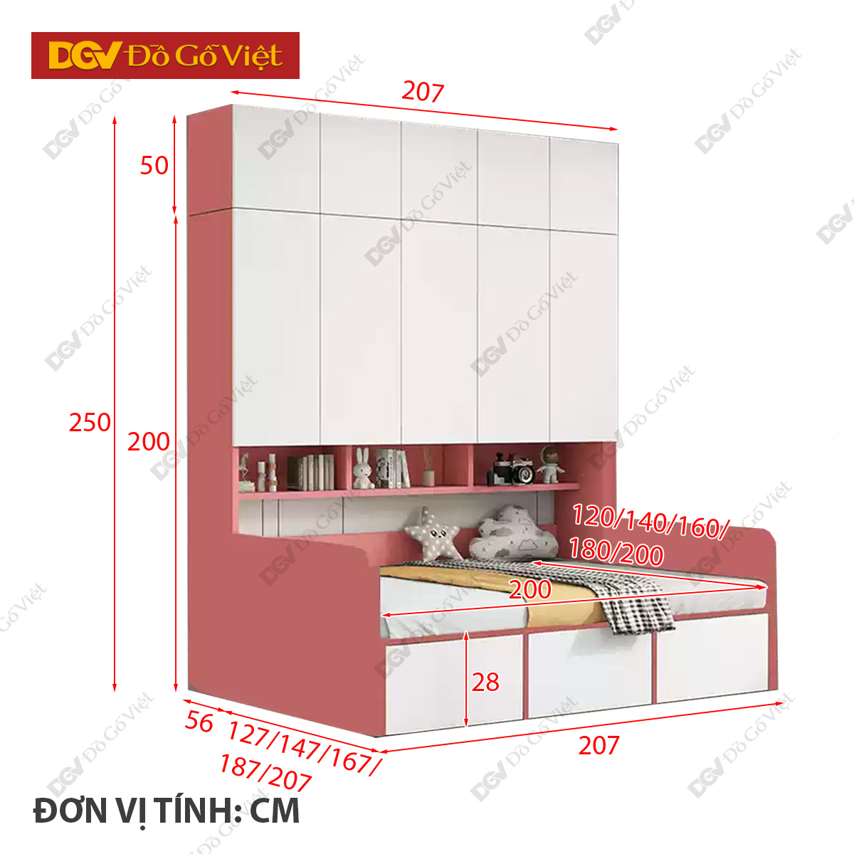 Giường Liền Tủ Quần Áo Kèm Kệ Để Đồ Màu Hồng Cánh Trắng