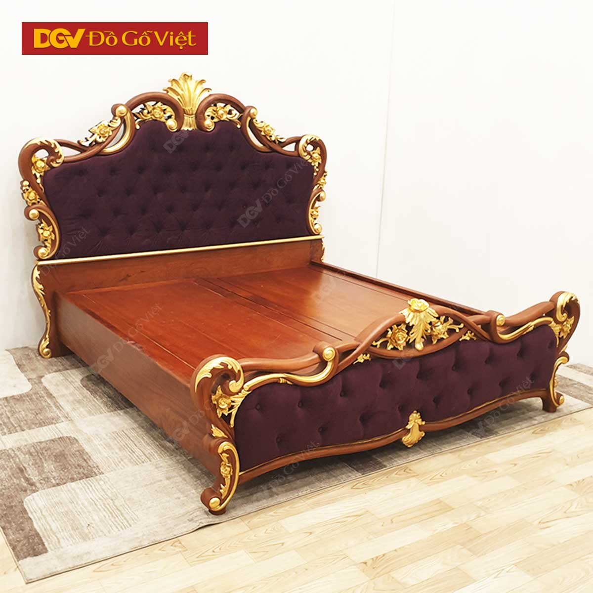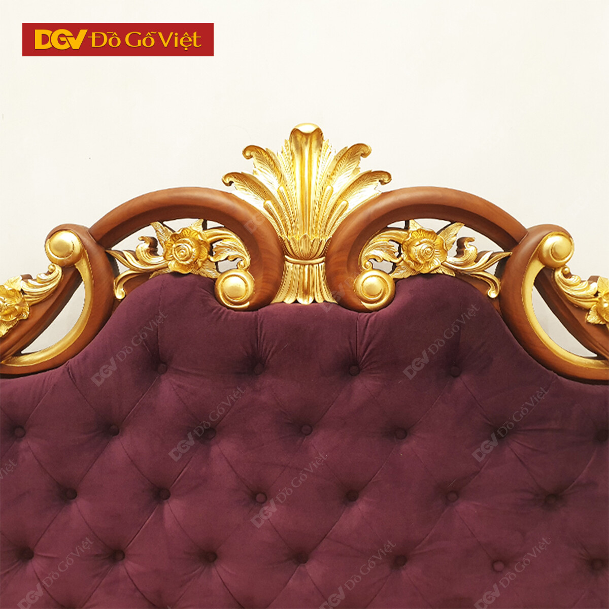 Đầu giường gõ đỏ cổ điển được chạm đục họa tiết hoa lan tây xòe rộng với những tán lá cong nhẹ quyến rũ. Xuôi dần về hai bên là thiết kế mang tính đối xứng với các đường viền khung gỗ uốn lượn được xen kẽ cùng hoa hồng và hoa lan tây cuộn tròn. Tất cả được khéo léo lồng ghép để vừa bổ trợ cho thiết kế mà vẫn đảm bảo được nét riêng cho từng chi tiết.