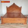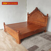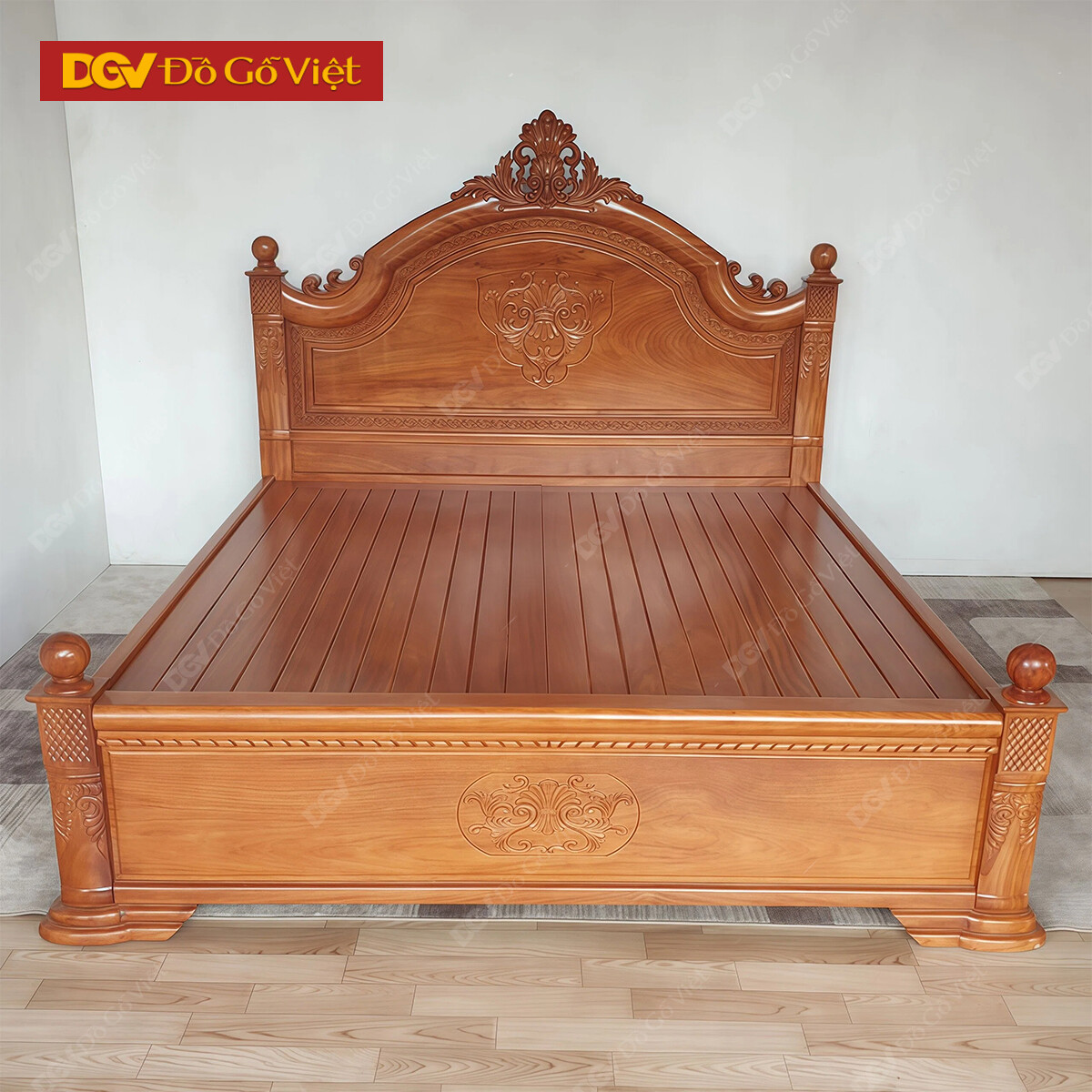 Đầu giường ngủ gỗ gõ đỏ chạm nổi hoa văn lan tây với các chi tiết được cuộn tròn, cách điệu cầu kỳ nổi bật trên chất liệu gỗ. Bên ngoài là đường viền uốn lượn tạo thành hình dạng huy hiệu hoàng gia vô cùng sáng tạo. Thiết kế chân trụ chạm hình thoi với phần đỉnh được triện tròn đẹp đậm chất hoàng gia châu Âu.