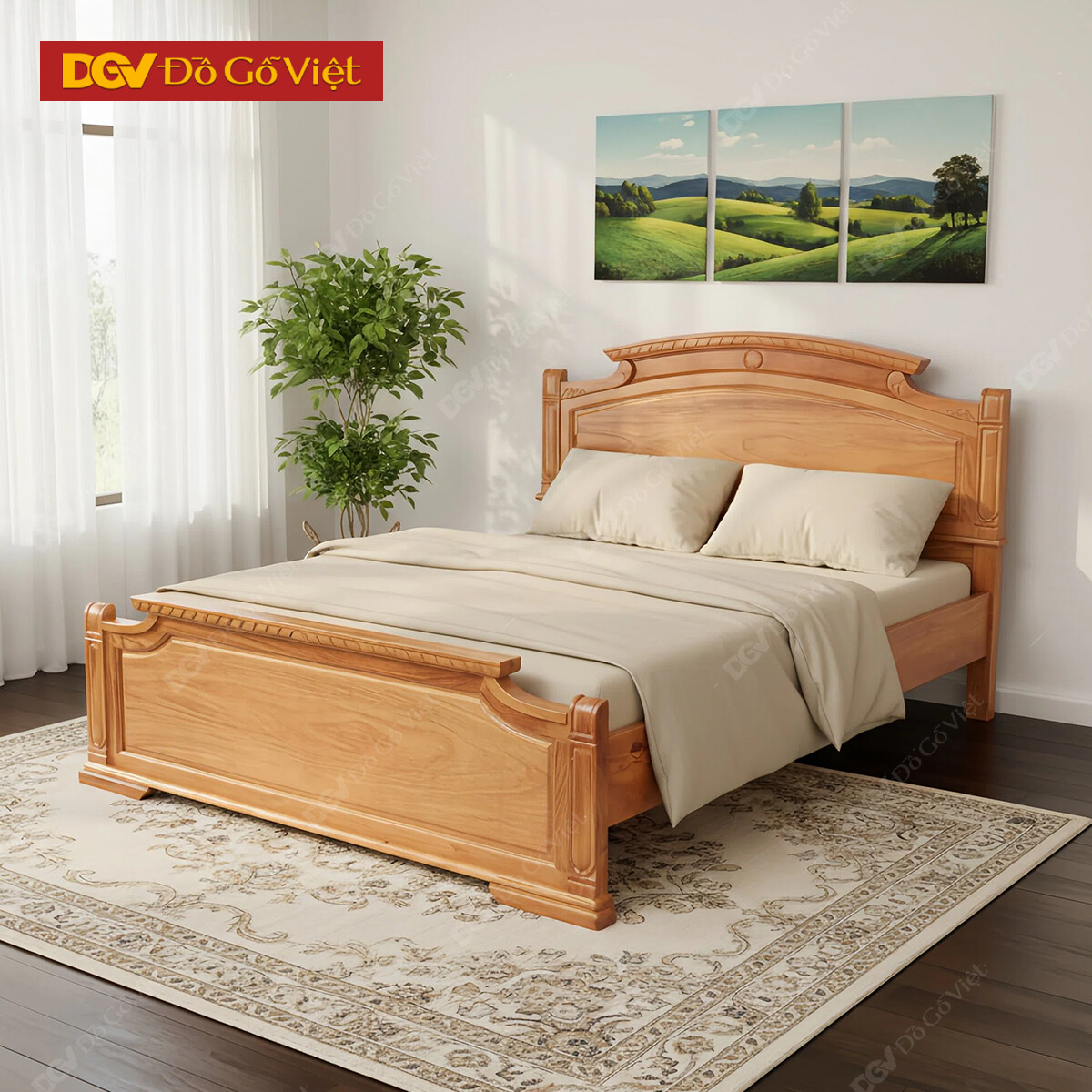 Mẫu giường ngủ chất liệu gỗ tự nhiên này được thiết kế mang đậm chất truyền thống với hoa văn trang trí kiểu dáng rẻ quạt được thiết kế đối xứng tạo cho người sử dụng cảm giác hài hòa ở nhiều góc nhìn. Phần đỉnh giường được nâng cao và thon dài sang hai bên, uốn lượn nhẹ nhàng dọc theo phần khung giường mềm mại đầy tính nghệ thuật.