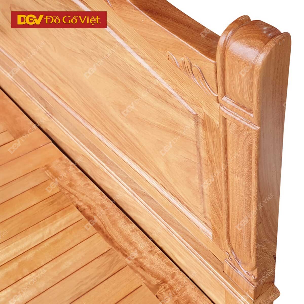 Khung giường được hoàn thiện từ gỗ gõ đỏ chất lượng tốt, chống lại được các ảnh hưởng xấu từ môi trường và thời tiết như mối mọt, cong vênh, ẩm mốc,... Bên ngoài sản phẩm được phủ lên một lớp sơn PU để giúp sản phẩm luôn sáng bóng và sử dụng được lâu dài.
