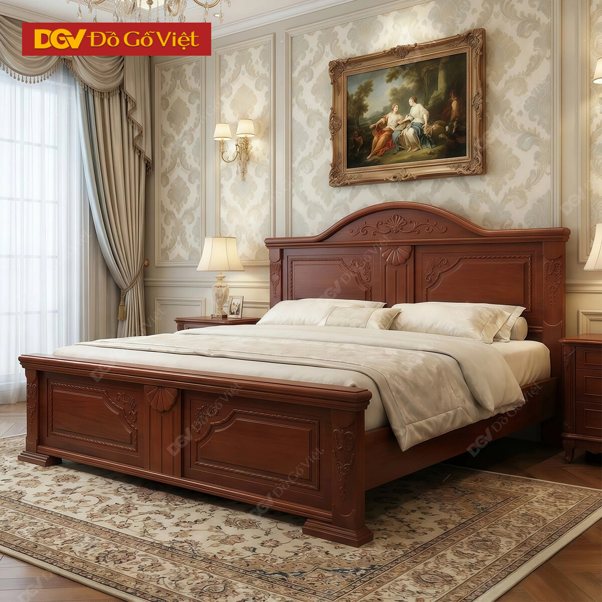 Giường Ngủ Gỗ Căm Xe Tân Cổ Điển Kẻ Sọc Dọc Phối Hoa Văn