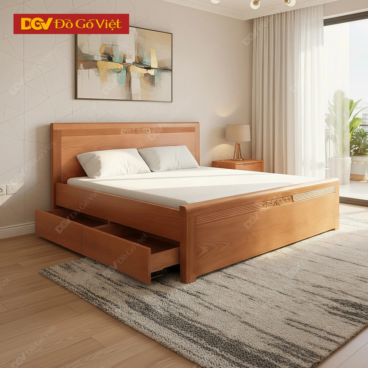 Giường Ngủ Gỗ Sồi Nga Mẫu Chạy Chỉ Hoa Có Ngăn Kéo Đẹp