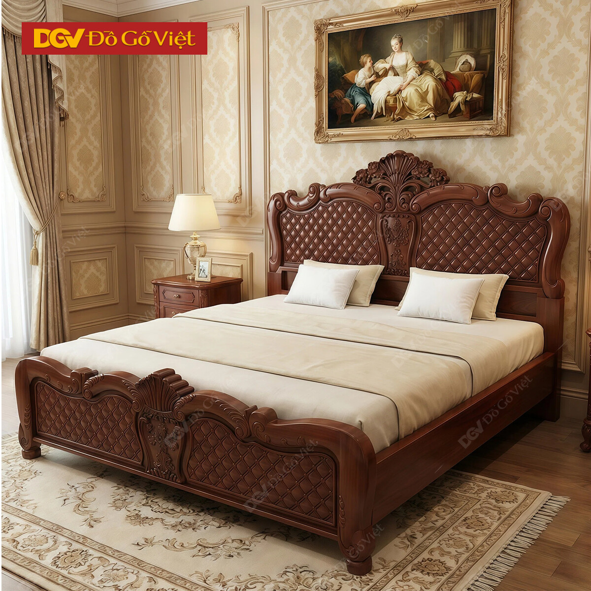 Mẫu Giường Ngủ Gỗ Xoan Đào Sang Trọng Vòm Sò Chạm Gấm Caro
