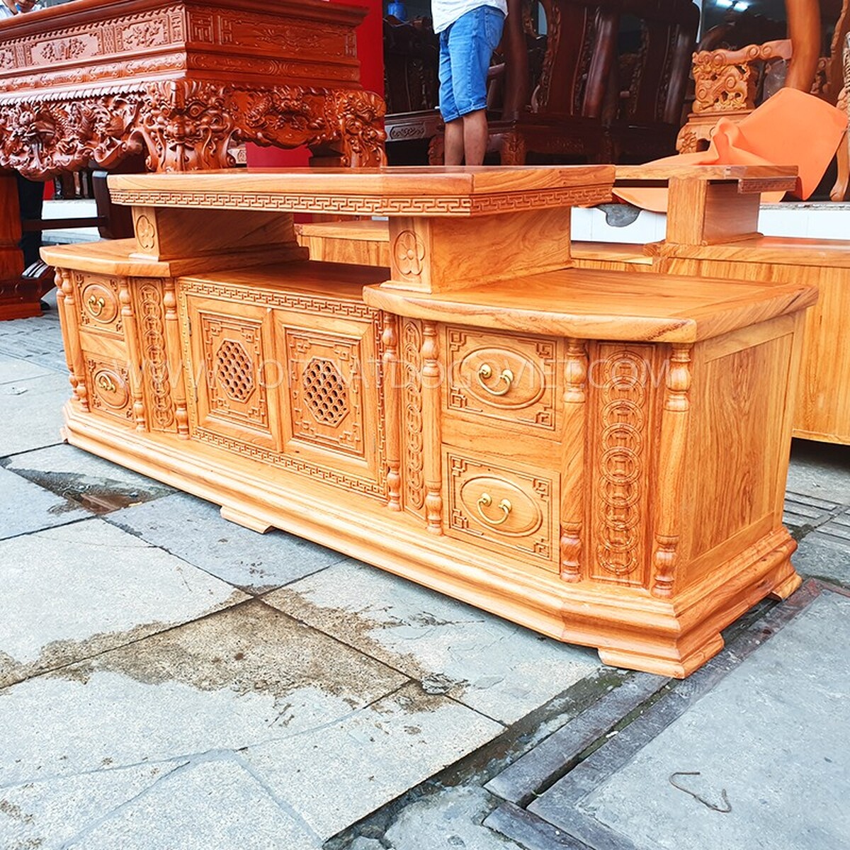 Mẫu kệ tivi gỗ gõ đỏ được làm 100% từ chất liệu gỗ gõ đỏ tự nhiên đem đến một vẻ ngoài thân thuộc, mộc mạc và gần gũi với người sử dụng. Gam màu vàng gõ được phô bày trọn vẹn với các vân gỗ mềm mại đẹp mắt. Bạn có thể hoàn toàn an tâm về chất lượng sản phẩm bởi theo năm tháng trôi qua, gỗ gõ đỏ sẽ lại càng lên màu tươi sáng và sang trọng hơn.