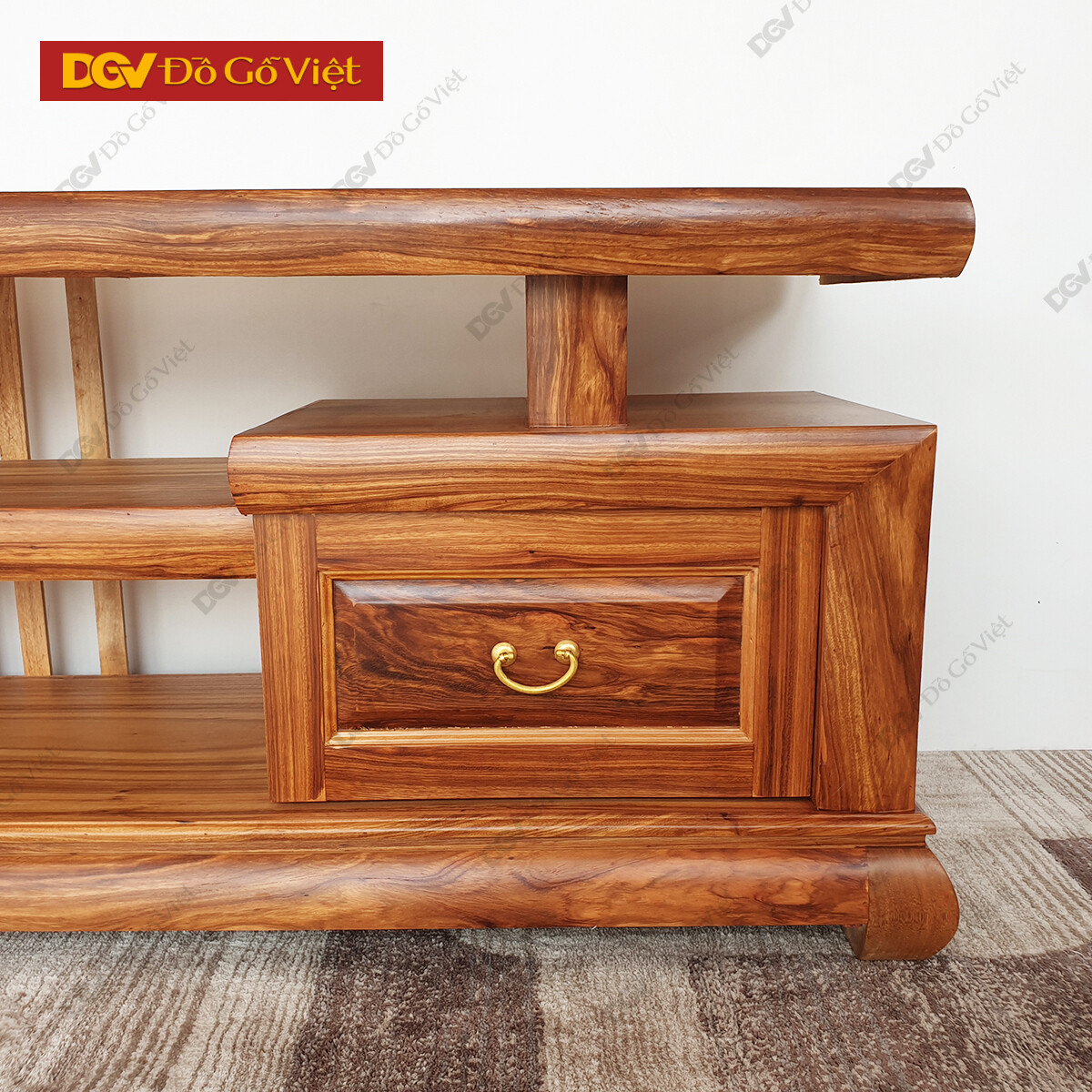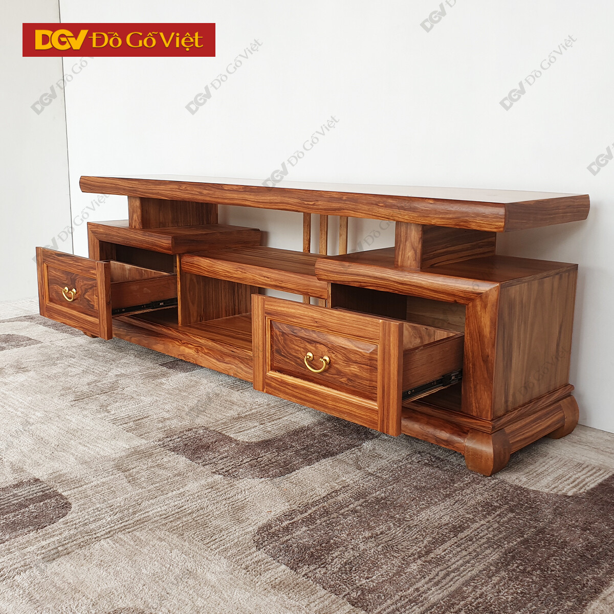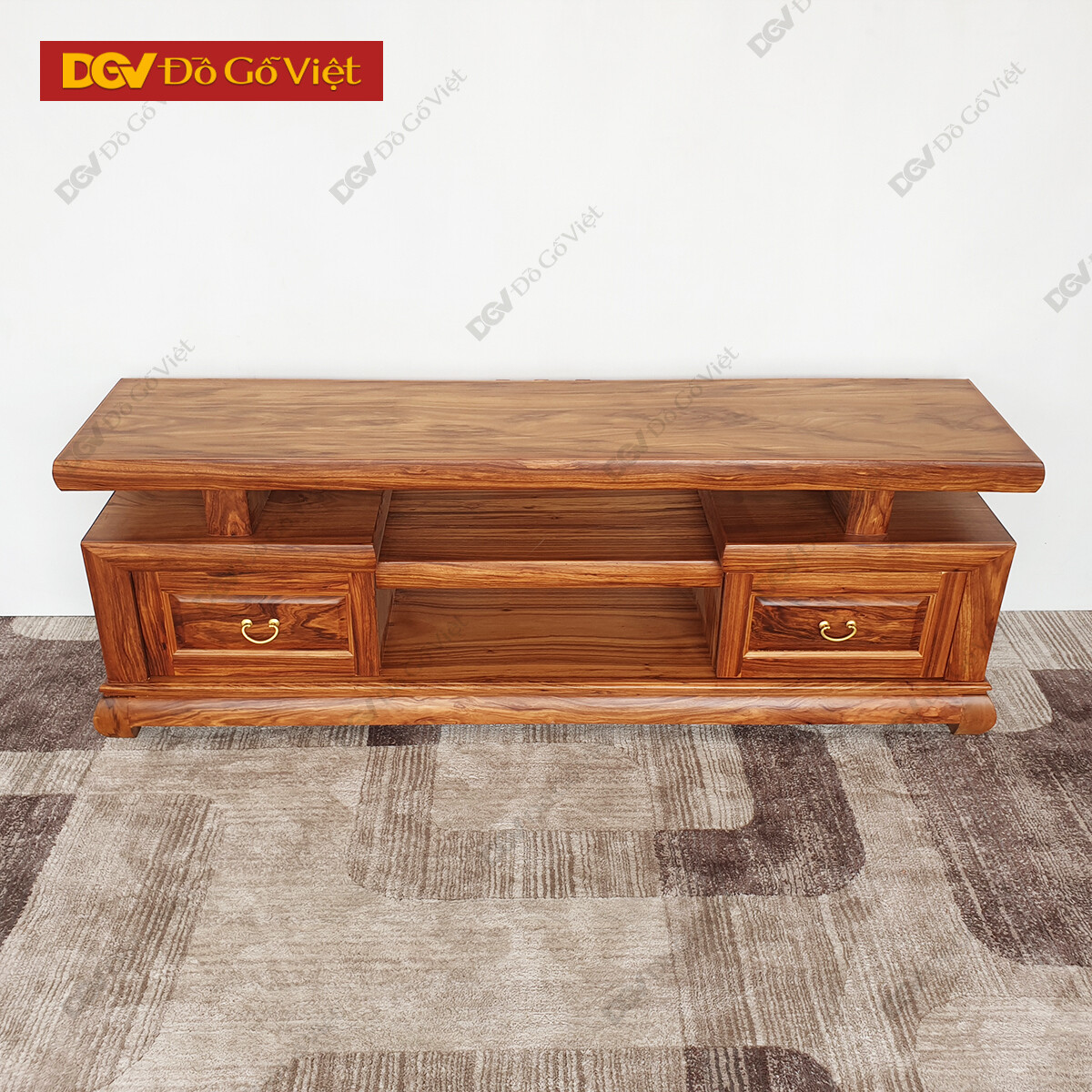 Tổng thể kệ tivi gỗ hương xám được tạo nên từ những chi tiết gỗ nguyên tấm, nguyên khối với thiết kế vuông vắn, góc cạnh đem lại cho không gian của gia đình sự lịch lãm, trang nhã. Kiểu dáng đối xứng với các đường viền cạnh gỗ đều được mài nhẵn và bo tròn mang lại hiệu ứng bắt sáng tốt, ấn tượng và cuốn hút hơn dưới ánh đèn LED phòng khách.