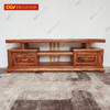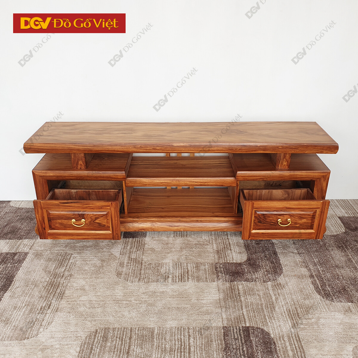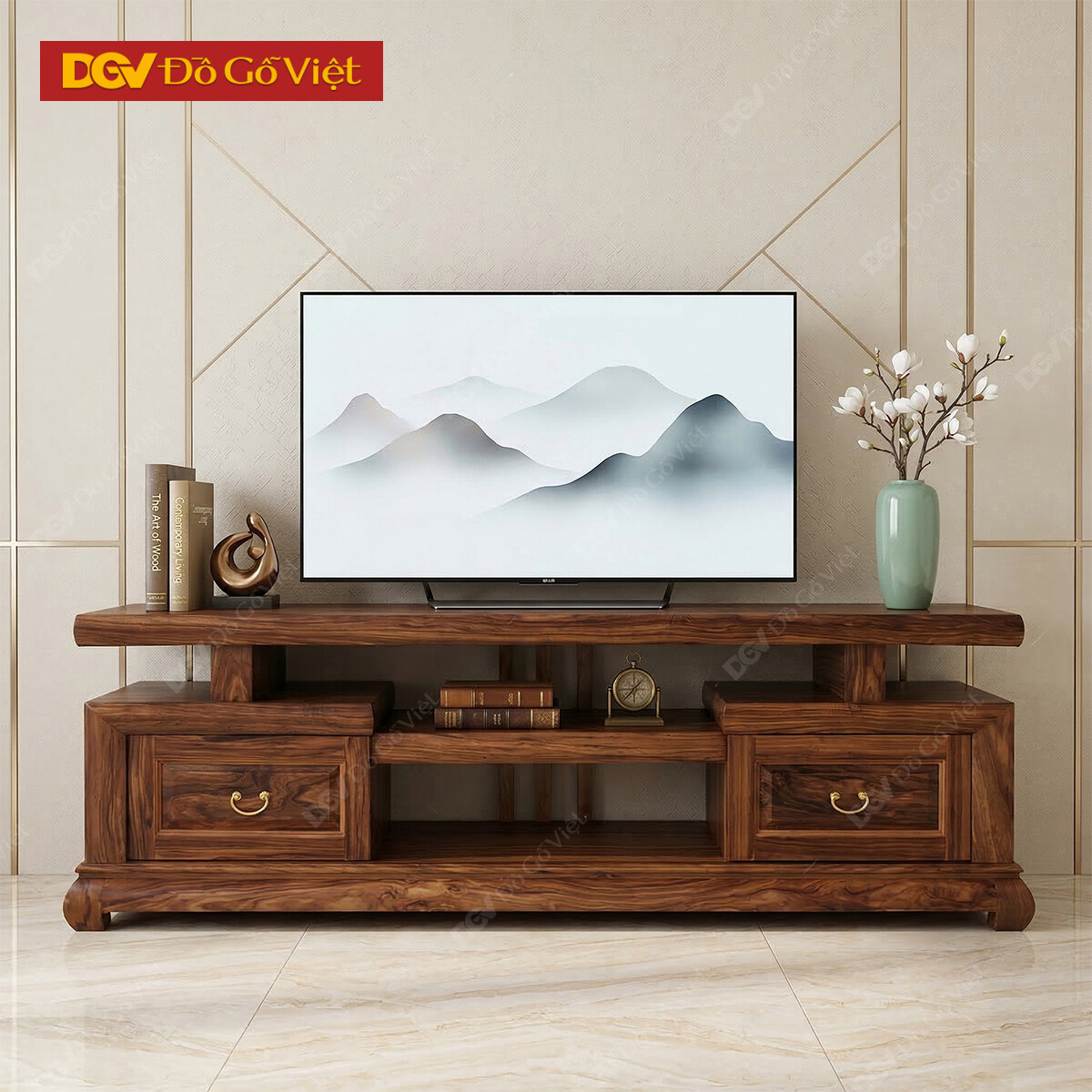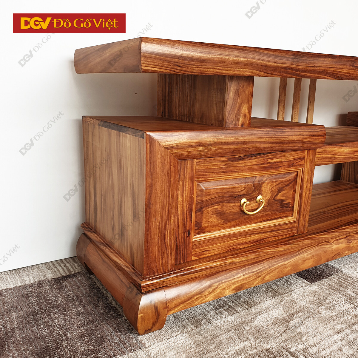 Tổng thể kệ tivi gỗ hương xám được tạo nên từ những chi tiết gỗ nguyên tấm, nguyên khối với thiết kế vuông vắn, góc cạnh đem lại cho không gian của gia đình sự lịch lãm, trang nhã. Kiểu dáng đối xứng với các đường viền cạnh gỗ đều được mài nhẵn và bo tròn mang lại hiệu ứng bắt sáng tốt, ấn tượng và cuốn hút hơn dưới ánh đèn LED phòng khách.