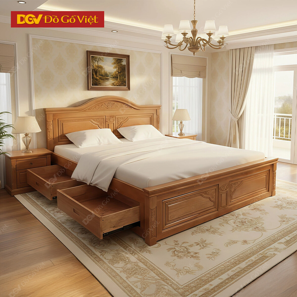 Mẫu Giường Gỗ Sồi Đầu Vòm Chạm Hoa Đẹp Kèm 2 Ngăn Kéo Vai