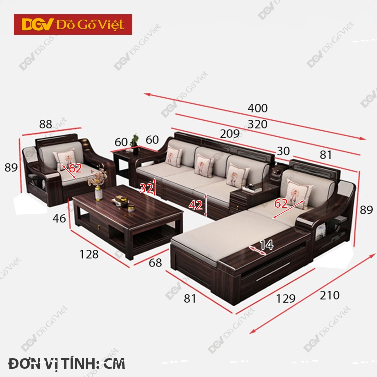 Kích thước bài trí nguyên bộ: Dài 380cm x Rộng 210cm x Cao 89cm (Tay 14, gỗ dày 4-5cm).