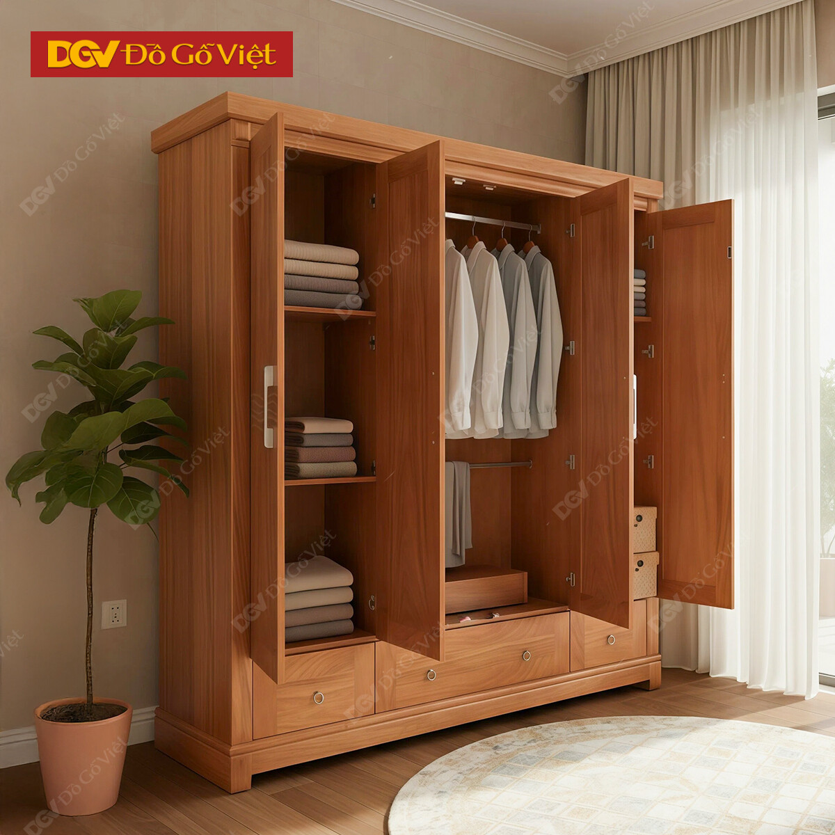 Tủ Gỗ Quần Áo 4 Cánh Pano Vân Gõ Đỏ Kết Hợp Kệ Trang Trí