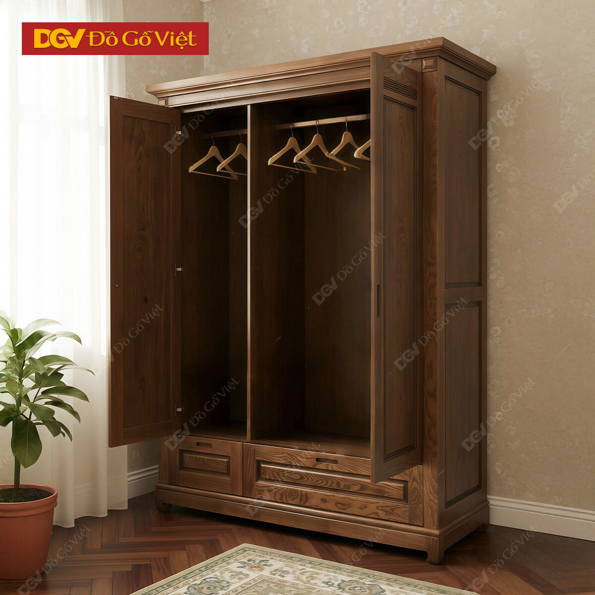 Tủ Áo Quần Đẹp Gỗ Sồi Nga Chạm Hoa Màu Óc Chó Hiện Đại