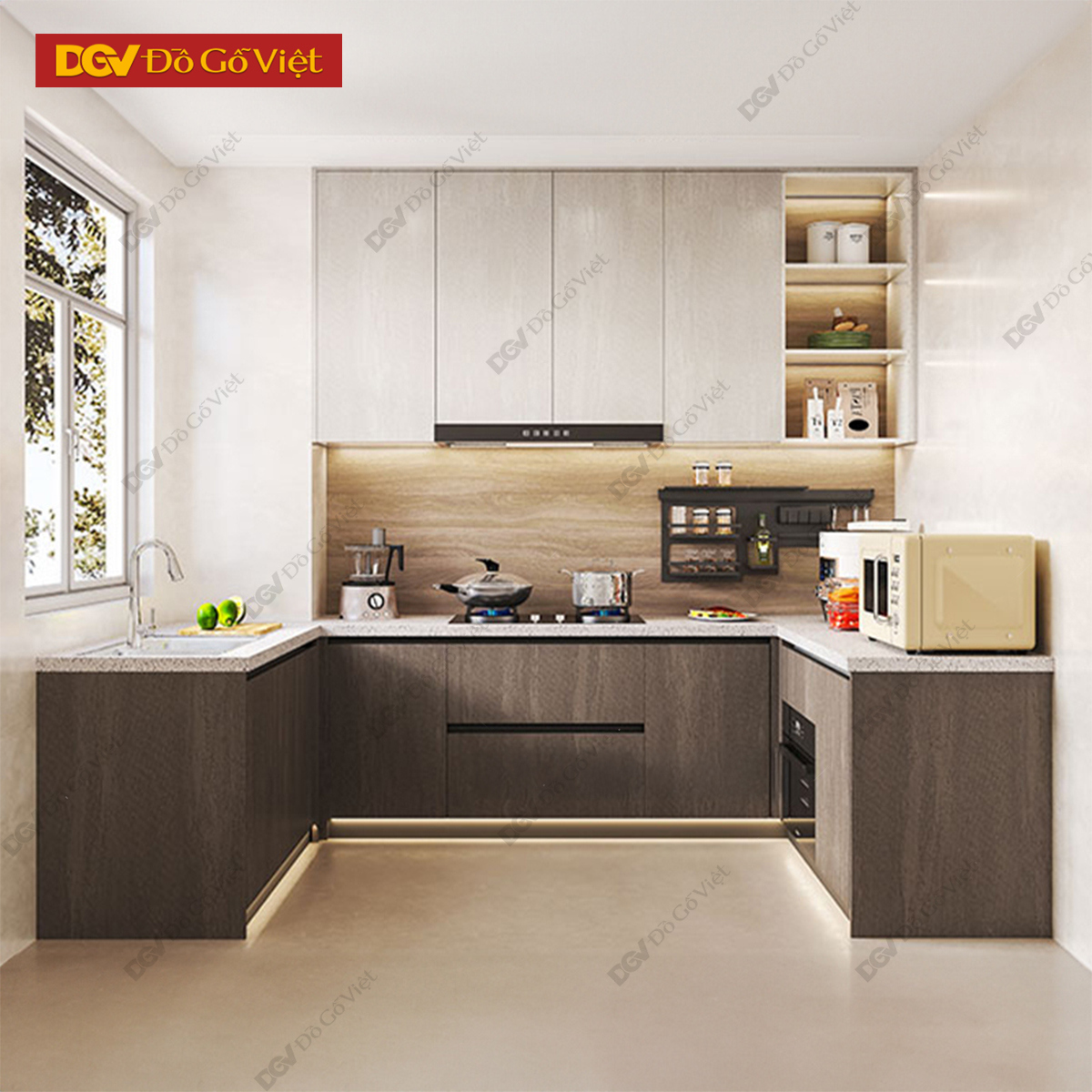 Tủ Bếp Chữ U Hiện Đại Với Kệ Trên Tối Giản Đầy Tiện...