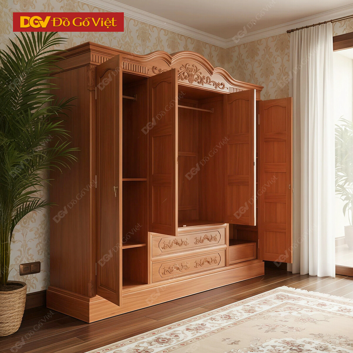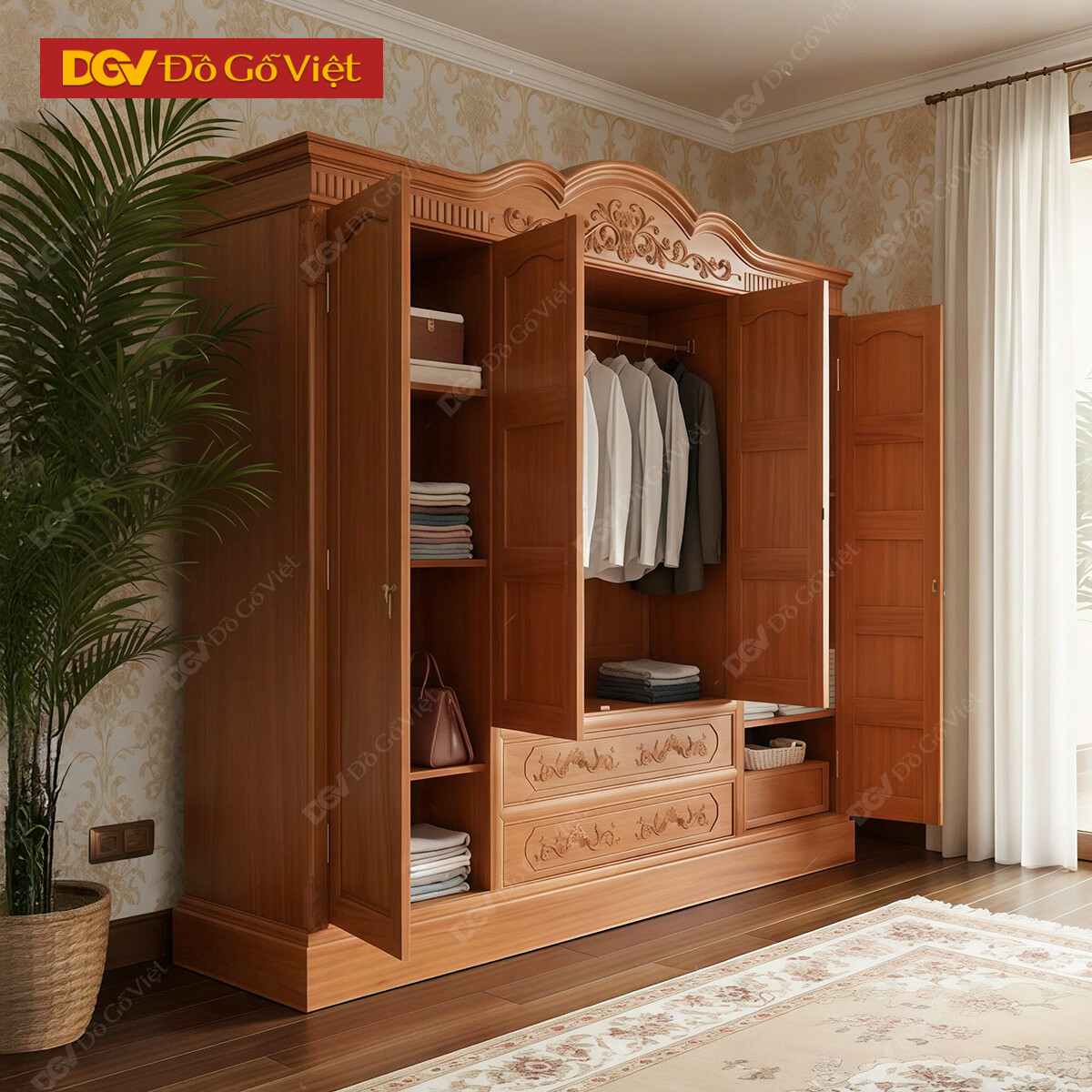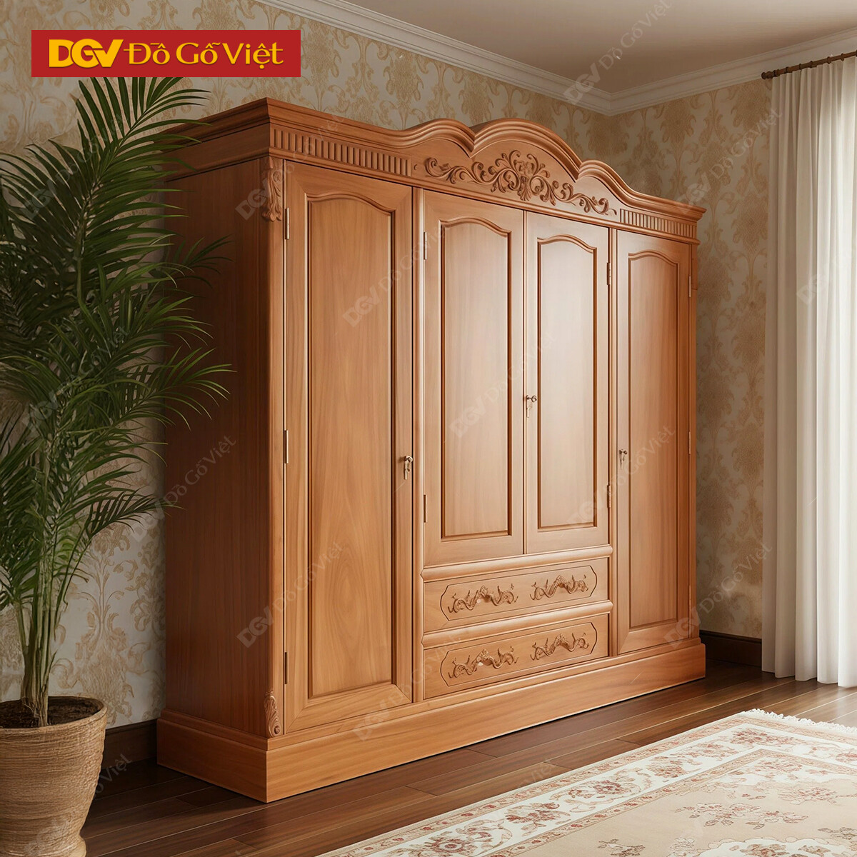 Mẫu Tủ Áo Gỗ Gõ Đỏ Mẫu Vòm 4 Cánh Trơn Kèm Ngăn Kéo Ngoài