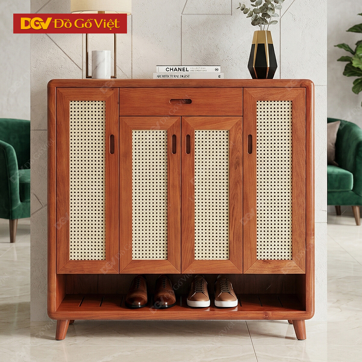 Tủ Giày Dép Hiện Đại Gỗ Hương Đá Kết Hợp Đan Mây Giá Rẻ