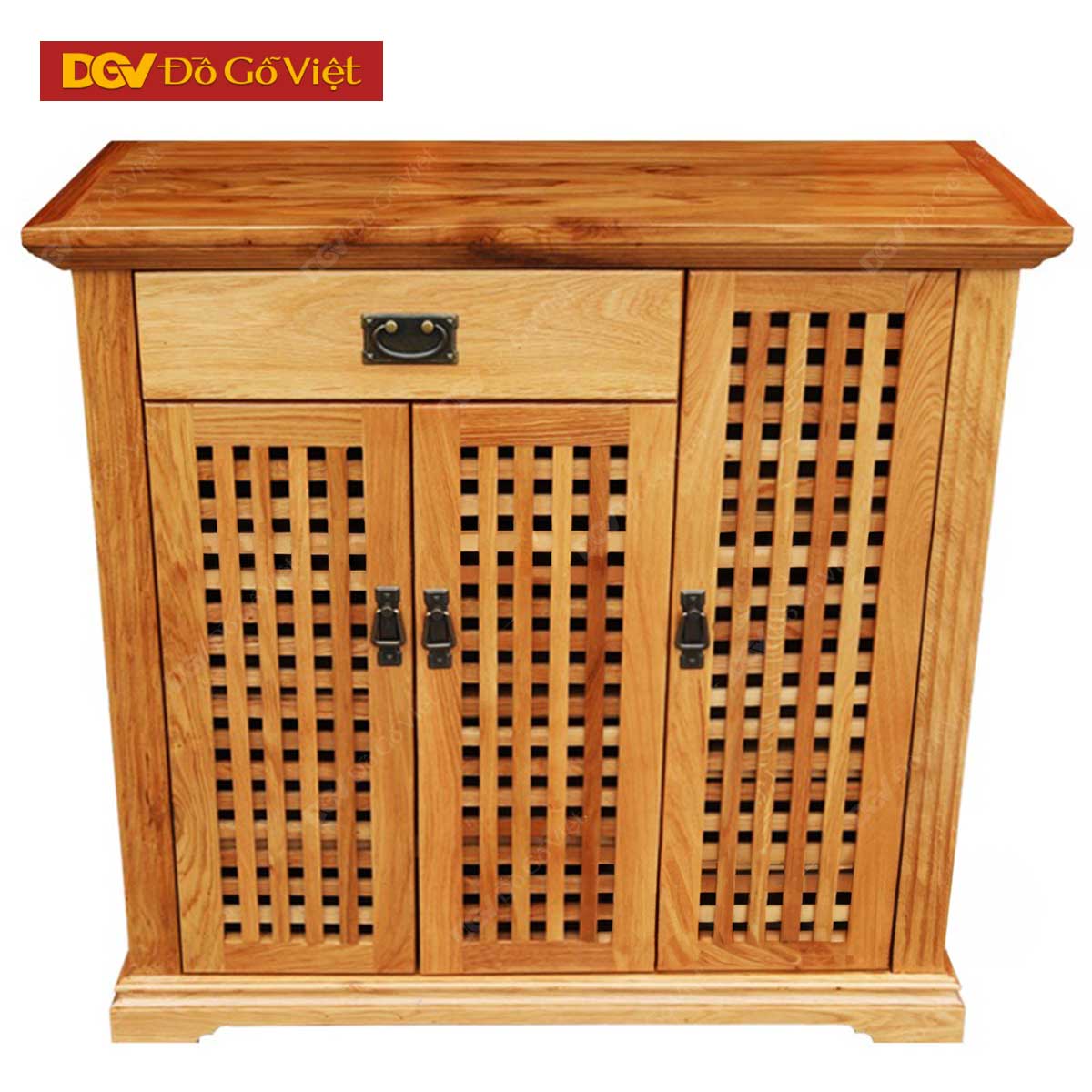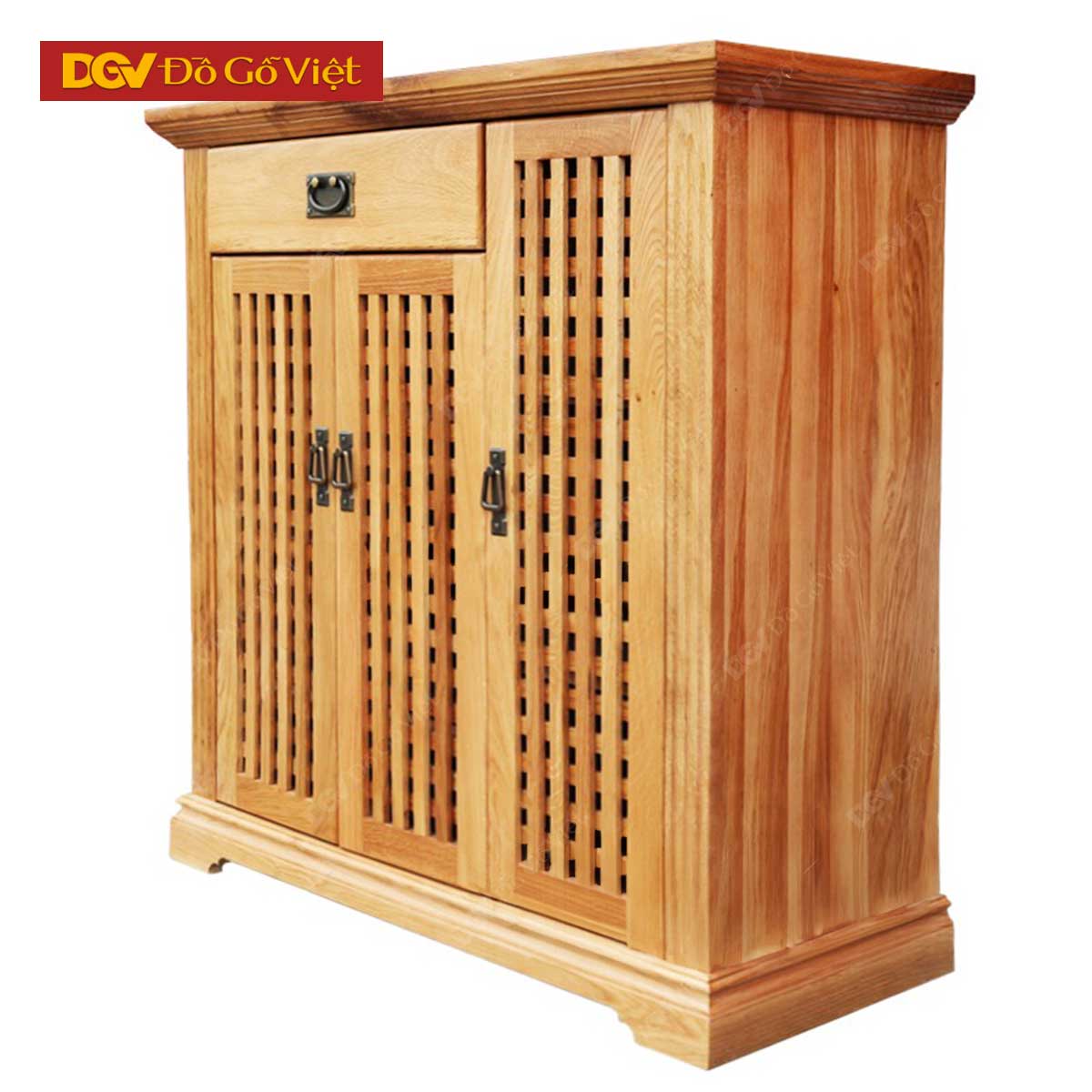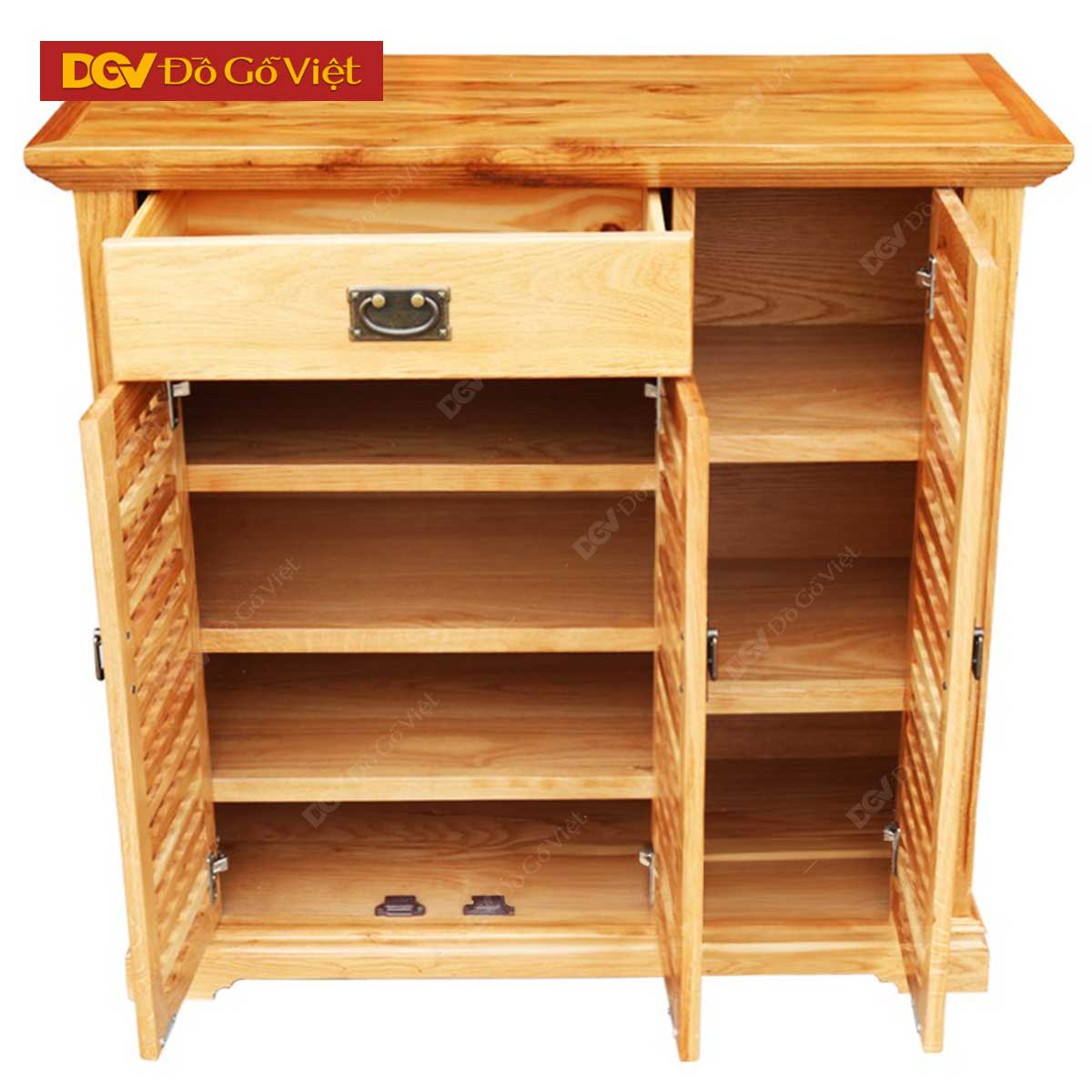 Tủ giày gỗ sồi được chia làm 3 cánh cửa, 2 buồng và 1 hộc tủ. Hai buồng tủ lại được chia nhỏ thành các ngăn tủ có kích thước khác nhau mang tới công năng đa dạng tùy theo mục đích sử dụng của khách hàng.