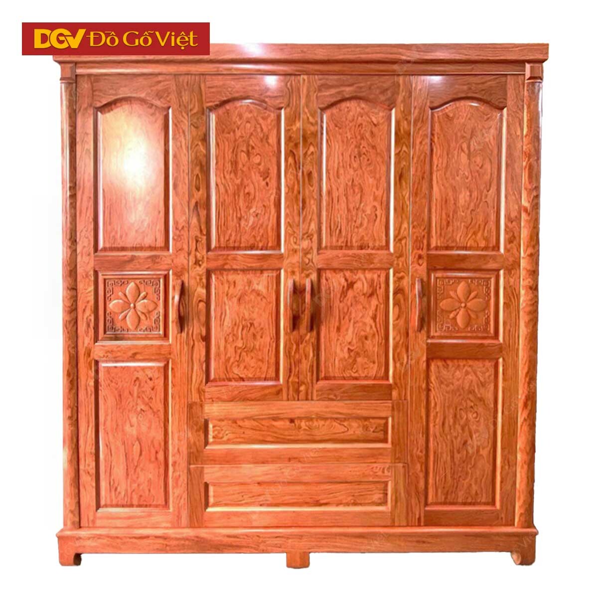 Tủ Để Quần Áo Gỗ Veneer Hương Đá Pano Cong Chạm Hoa 4 Cánh