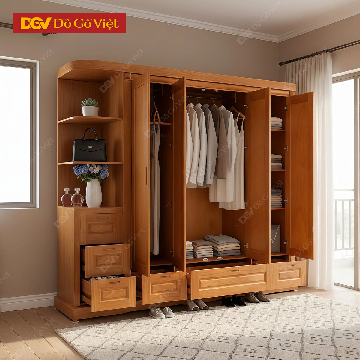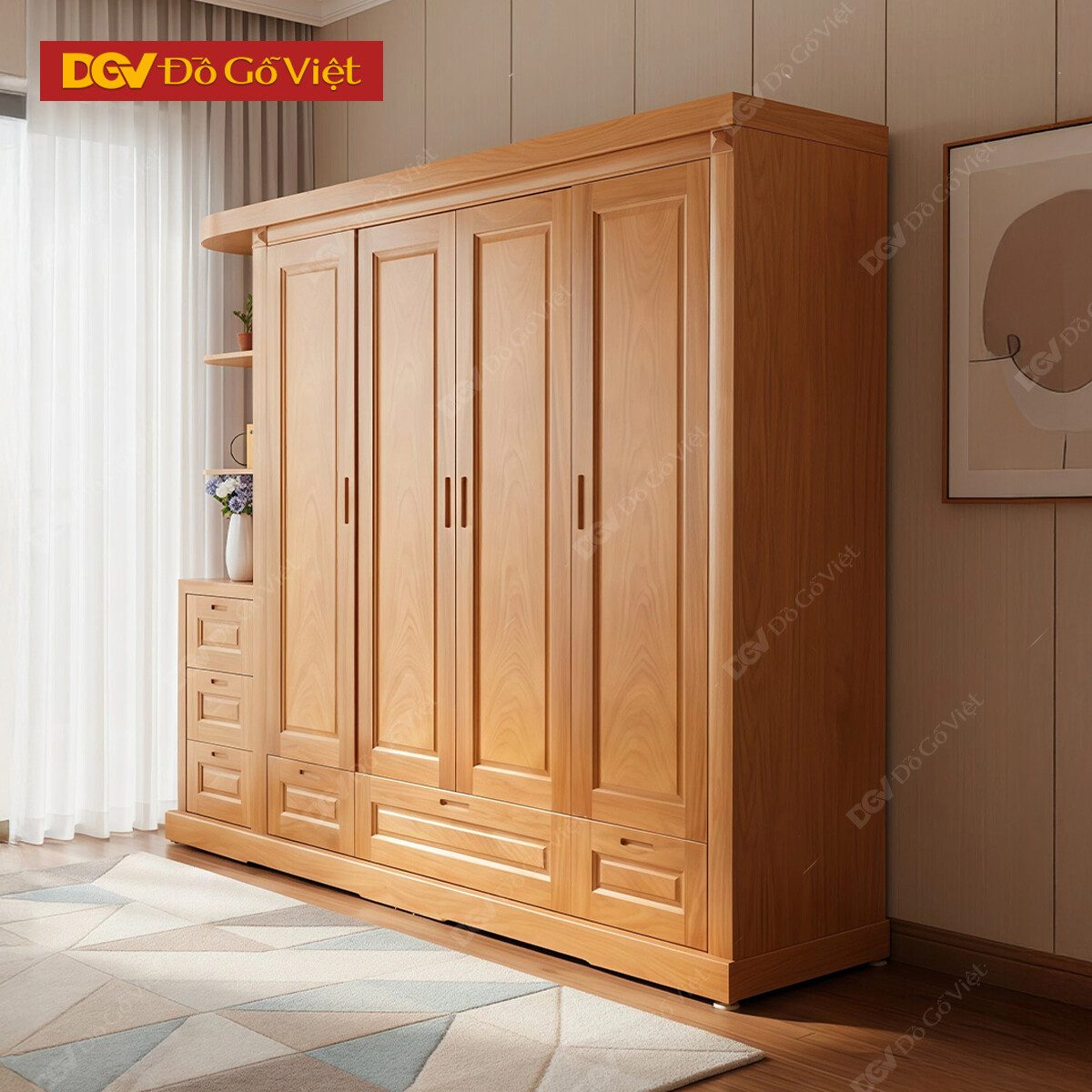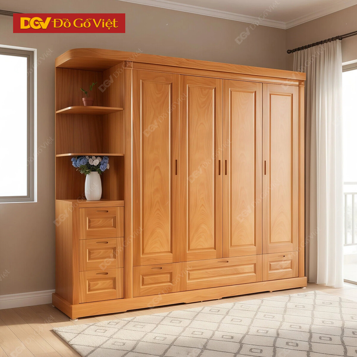 Tủ Gỗ Quần Áo 4 Cánh Pano Vân Gõ Đỏ Kết Hợp Kệ Trang Trí