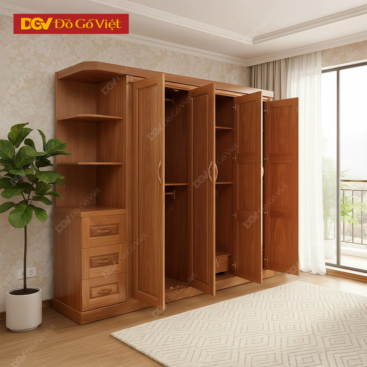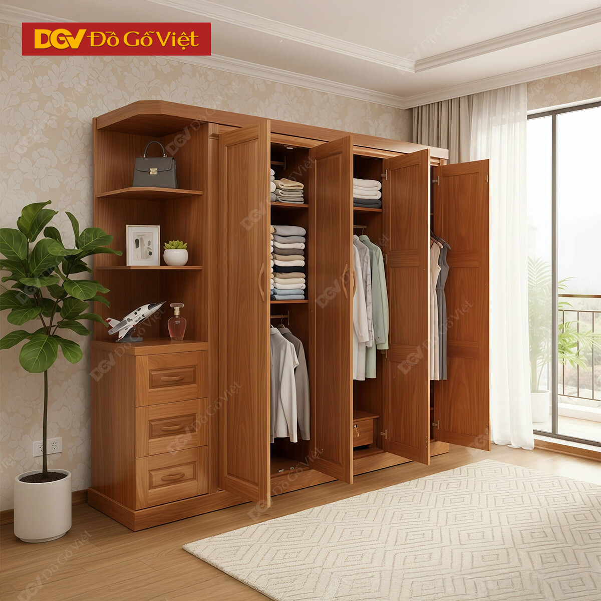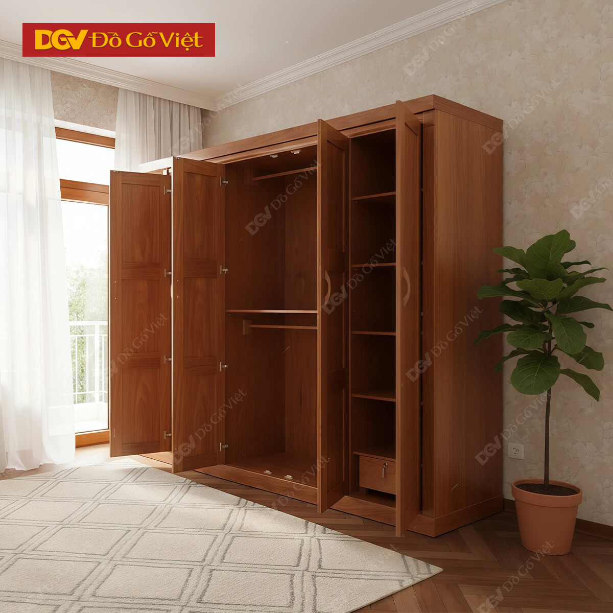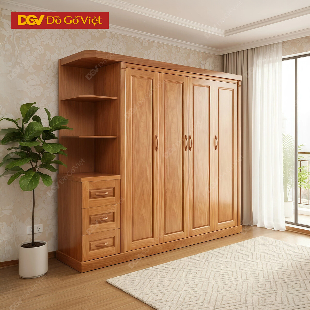 Tủ Quần Áo 4 Buồng Cánh Mở Truyền Thống Kèm Kệ Trang Trí