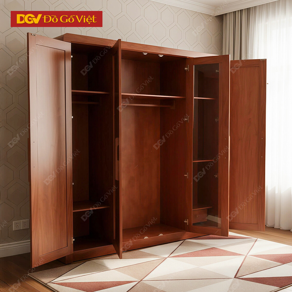 Tủ Quần Áo 4 Cánh Gỗ Veneer Hương Đá Pano Cong Đẹp Bền