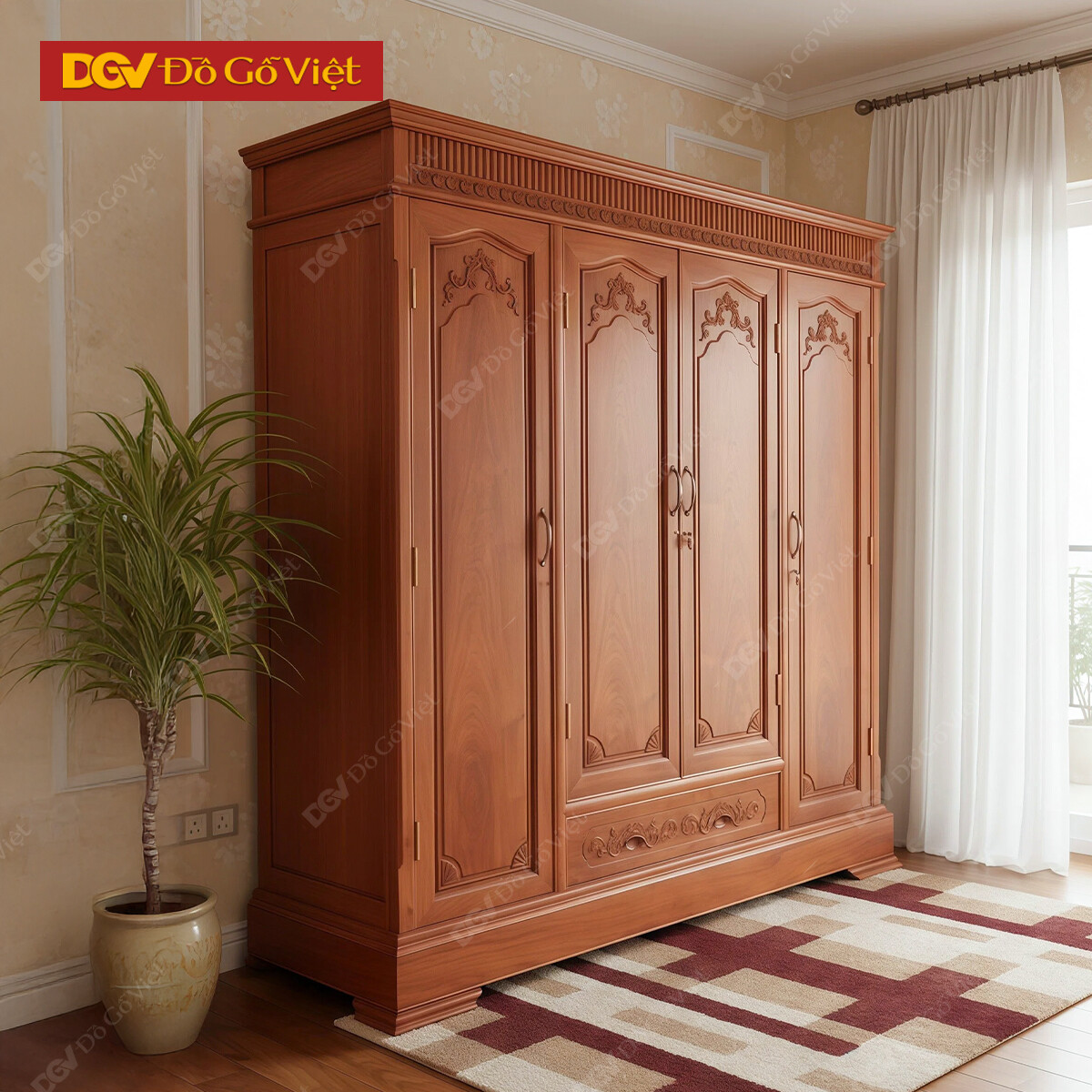 Tủ Quần Áo Gỗ 4 Cánh Hương Đá Chạm Quạt Tân Cổ Điển