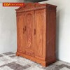 • Tủ áo được thiết kế gồm 3 cánh mở loại lớn với những tay nắm mộc hình con thoi được chạm dạng xoắn ốc khá độc đáo. Mặt cánh tủ dạng pano cổ điển với những hoa văn cuộn tinh tế với những đường viền nhẹ chạy đối xứng.