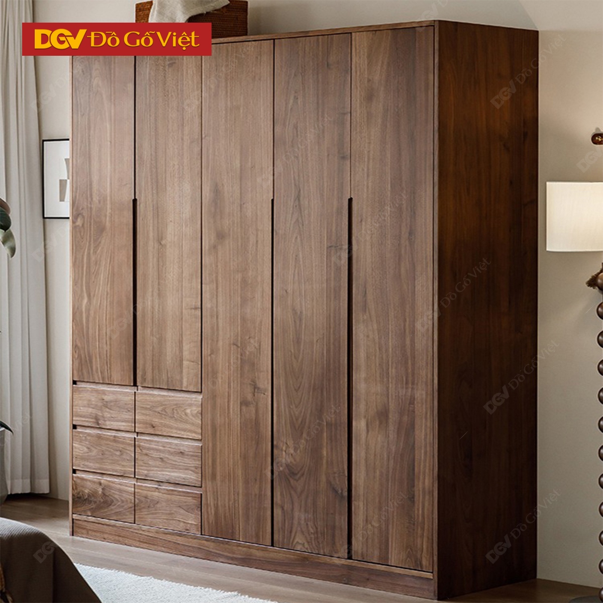 Tủ Quần Áo Gỗ Óc Chó 5 Cánh Rộng Rãi Kèm Ngăn Kéo Ngoài