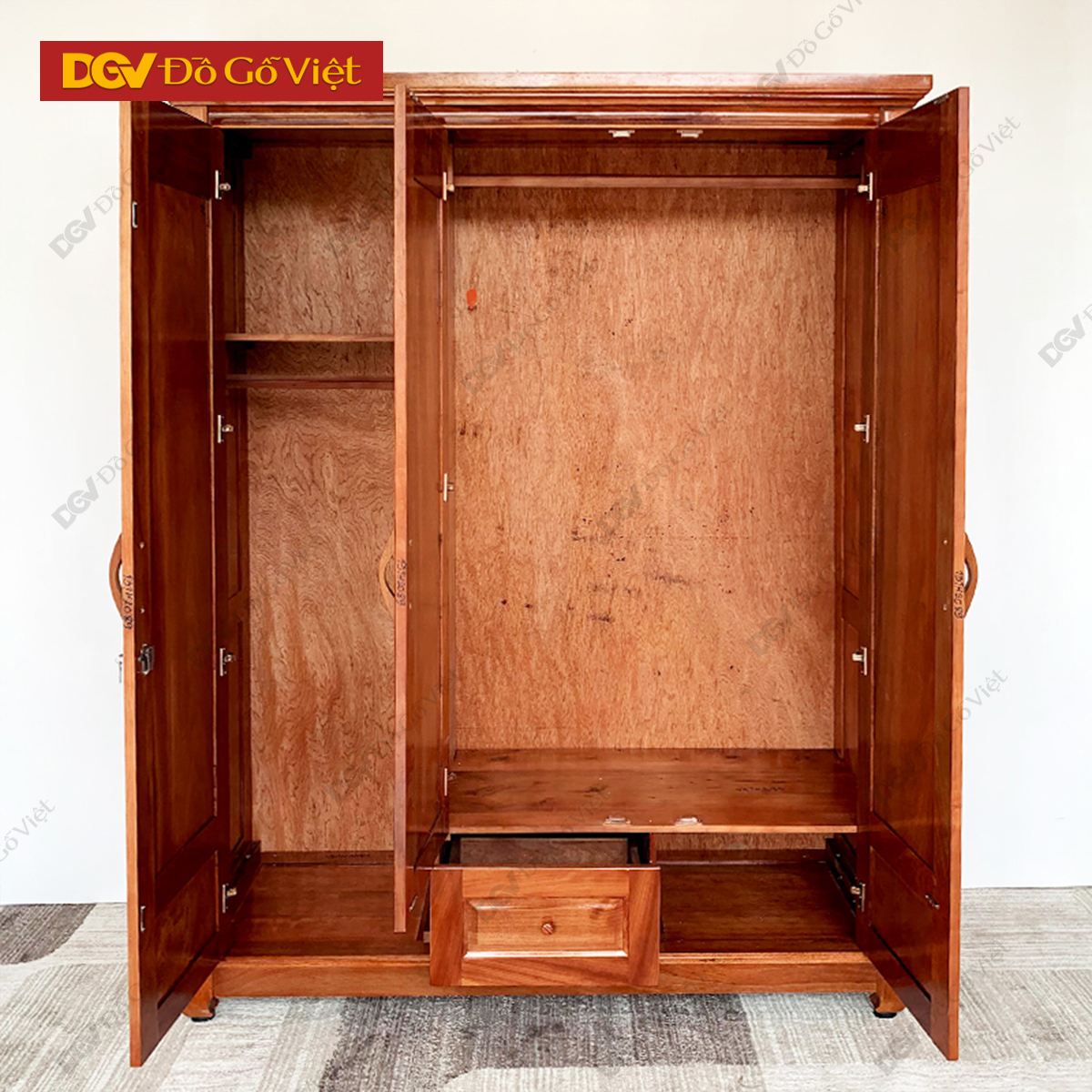 Bên trong tủ quần áo được chia làm 2 buồng không đồng đều với các ngăn, các giá treo đồ thực hiện các công năng riêng của mỗi bộ phận. Cá vách ngăn, cạnh tủ hay giá treo đều được mài nhẵn mịn để tránh trường hợp dằm gỗ có thể khiến quần áo bị hư hỏng hay ảnh hưởng đến khách hàng.