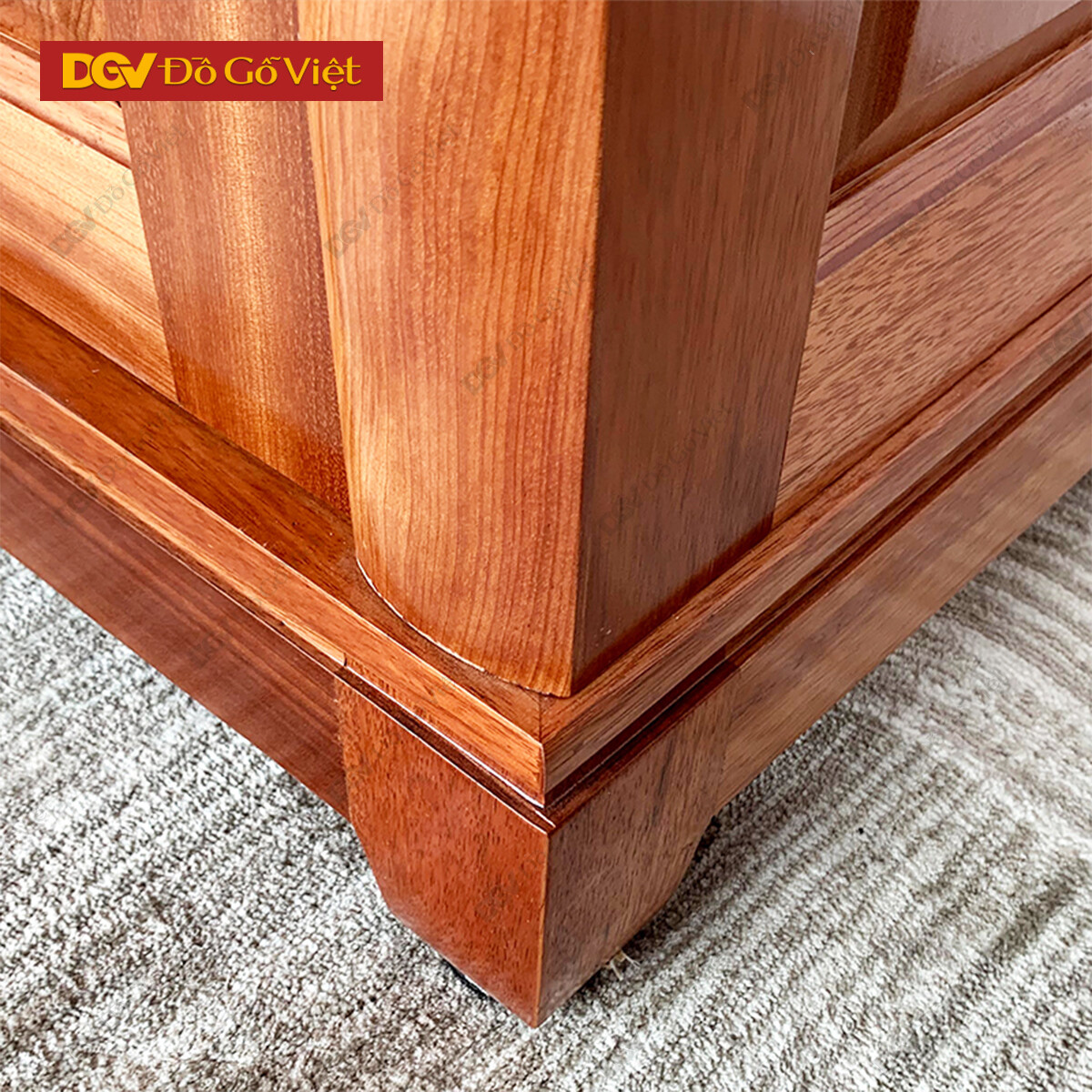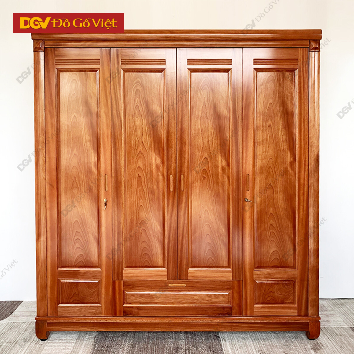 Kết cấu tủ quần áo xoan đào 4 cánh liền mạch được ghép nối kỹ lưỡng giữa các chi tiết từ các thanh xương vai tủ, cánh tủ, hậu tủ, các tấm kệ tủ đều được đóng mộng, bắt vít để đảm bảo tính liền mạch tối đa. Các bộ phận đều được tính toán kỹ càng để giữ được độ bền tốt dù có phải tháo lắp thường xuyên, kết cấu tủ được làm đơn giản để tự tháo lắp.