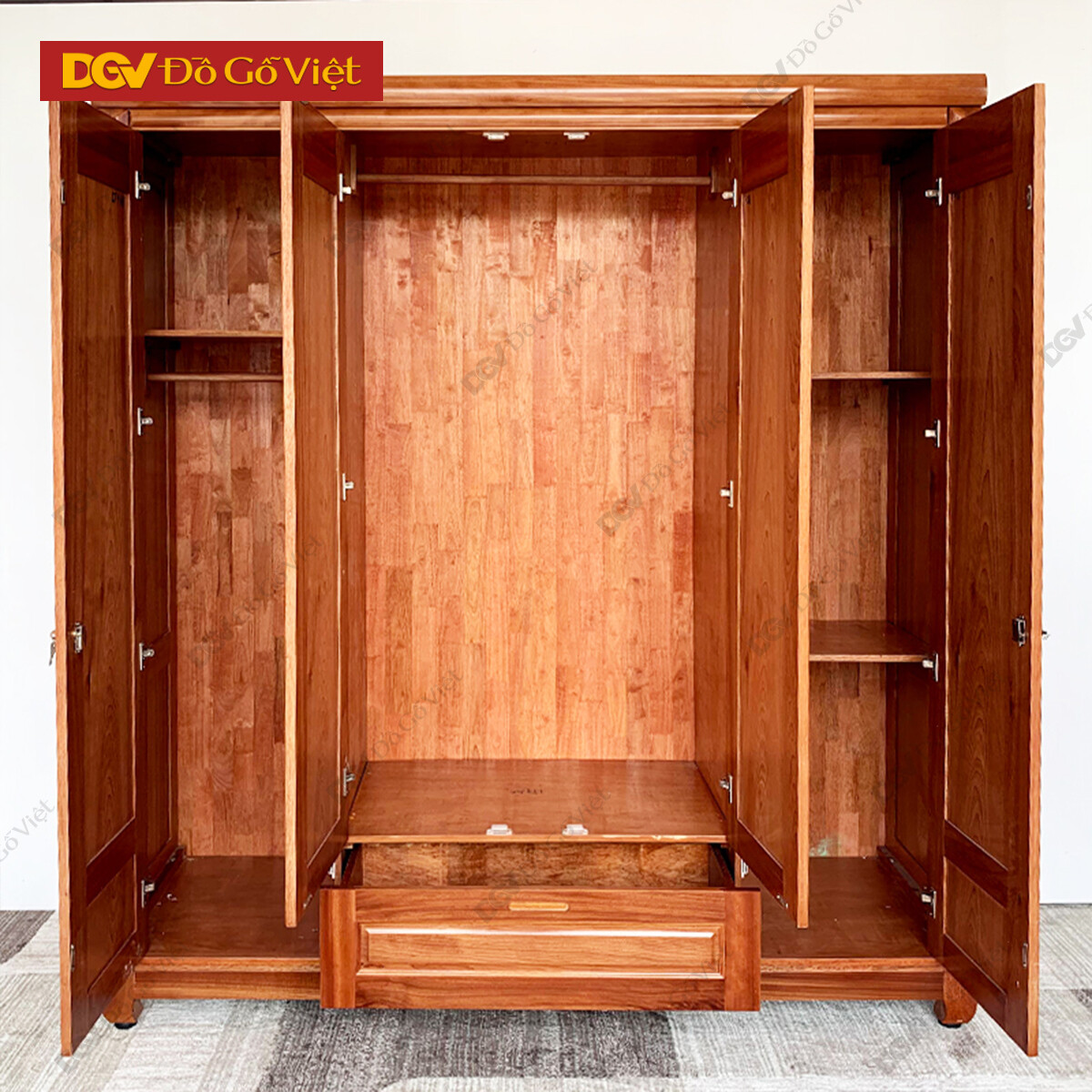 Nội thất tủ rộng rãi gổm 1 buồng treo lớn, 2 buồng treo nhỏ với 2 thanh treo riêng biệt, 4 kệ xếp, 1 hộc tủ để khách hàng có thể dễ dàng phân chia đồ dùng cho từng cá nhân trong gia đình. Ngăn tủ, hộc tủ với các thanh treo, các vách từ gỗ xoan đào nguyên khối chất lượng cao, khả năng chịu lực tốt, bền đẹp theo thời gian dài sử dụng.