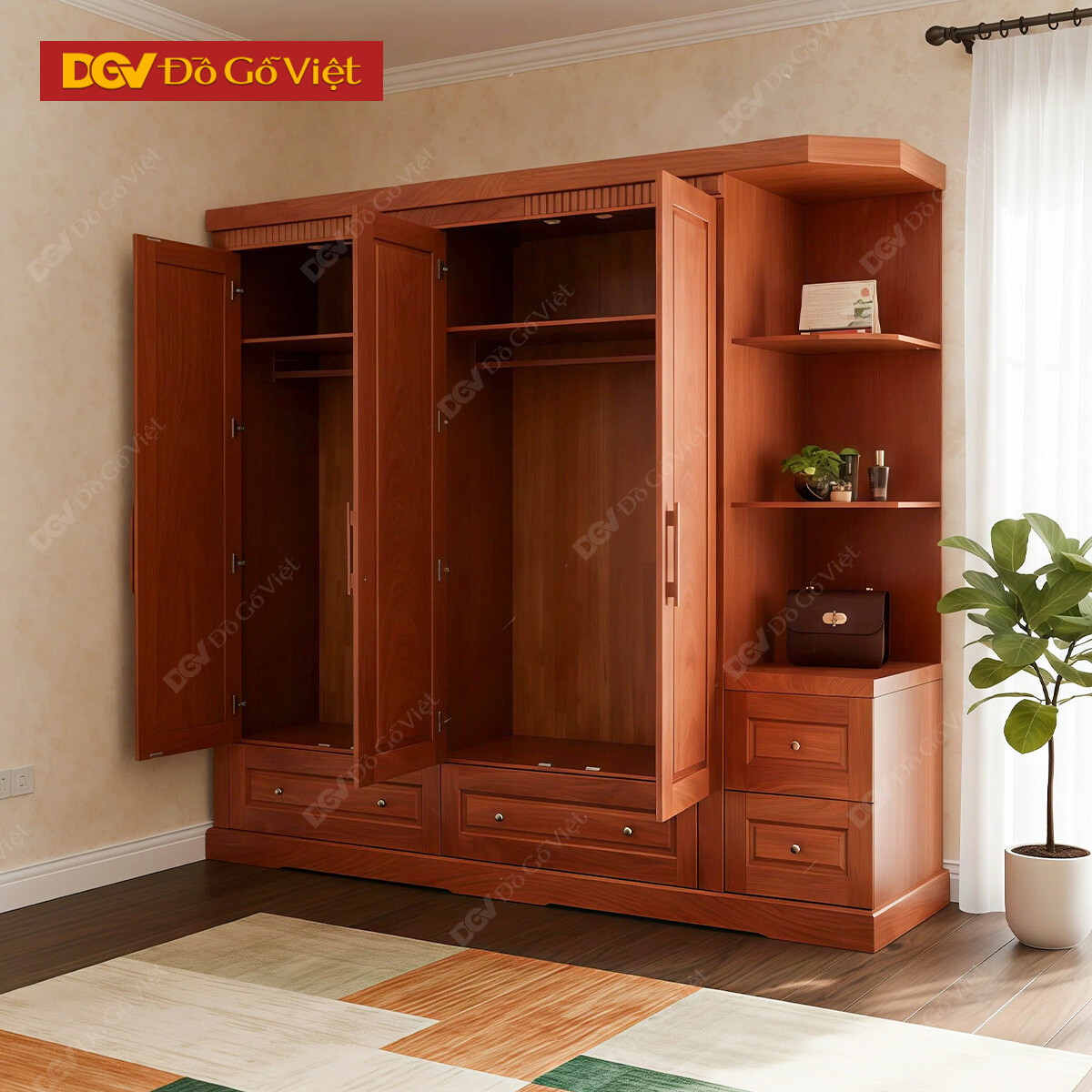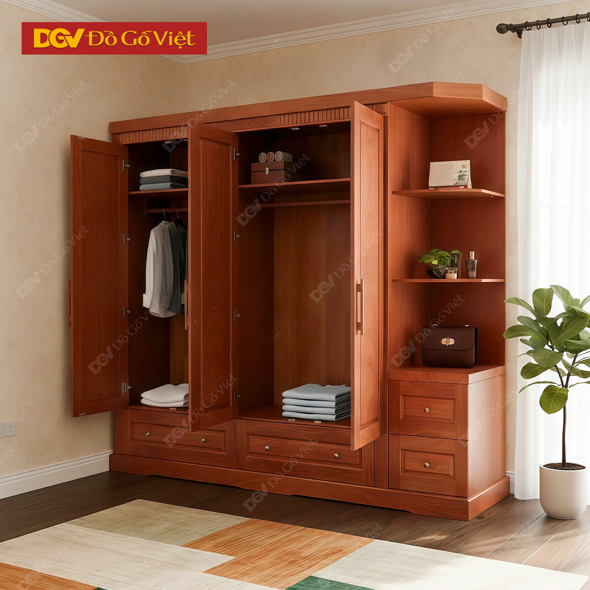Tủ Quần Áo 4 Cánh Gỗ Veneer Hương Đá Pano Cong Đẹp Bền