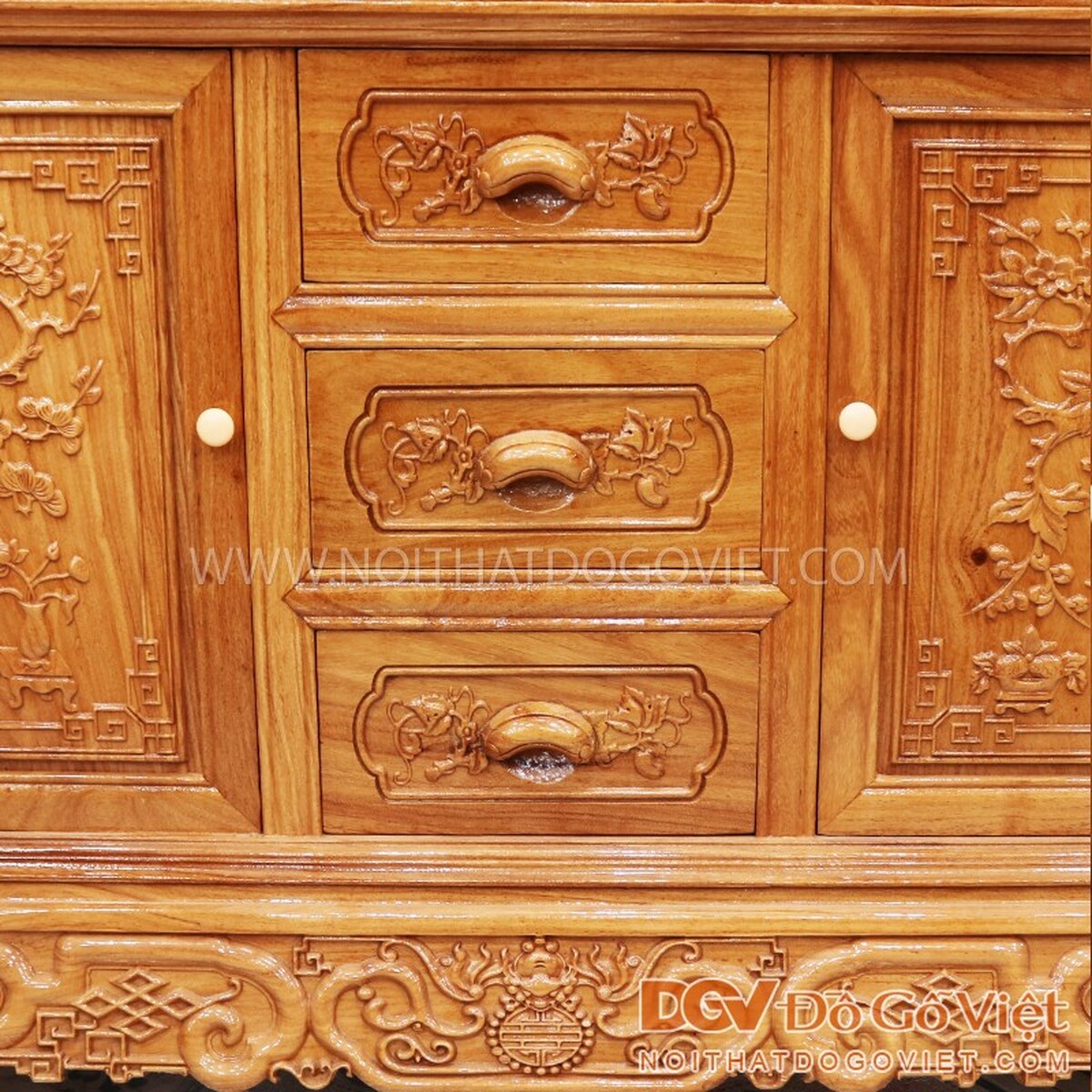 • Đỉnh tủ chạm đường viền hình chữ Vạn tượng trưng cho mặt trời, biểu tượng của điềm lành, may mắn, sự thanh tịnh và bình an. Mặt cánh tủ chạm họa tiết hoa nở tứ quý, đại diện cho 4 mùa, biểu thị cho sự hoàn hảo, hoàn mỹ, thể hiện mong ước của con người về sự bình an, sung túc, hạnh phúc, đuề huề.