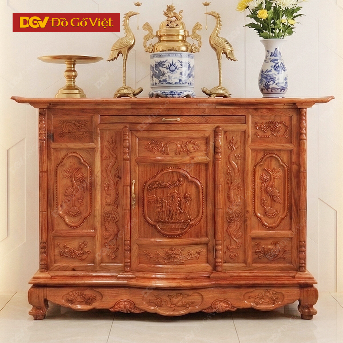Tủ Thờ Gia Tiên Cỡ Lớn Gỗ Hương Đá Bụng Phệ Chạm Tam Đa Đẹp