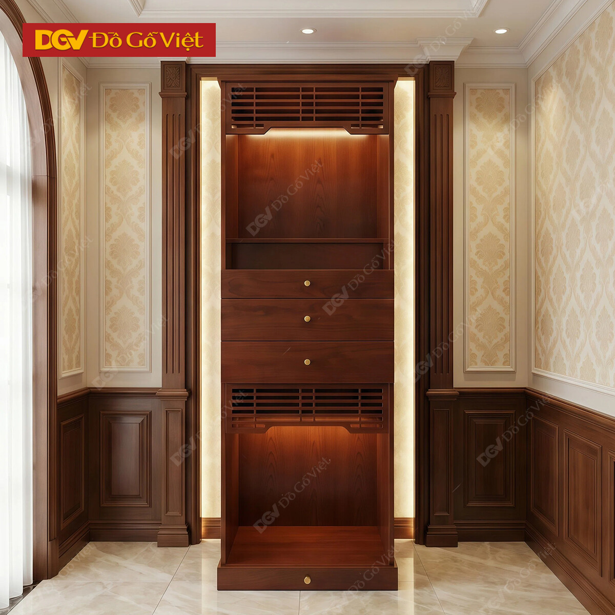 Tủ Thờ Hiện Đại Gỗ Veneer Sồi Dáng Cao Phối Ngăn Kéo Lưu trữ