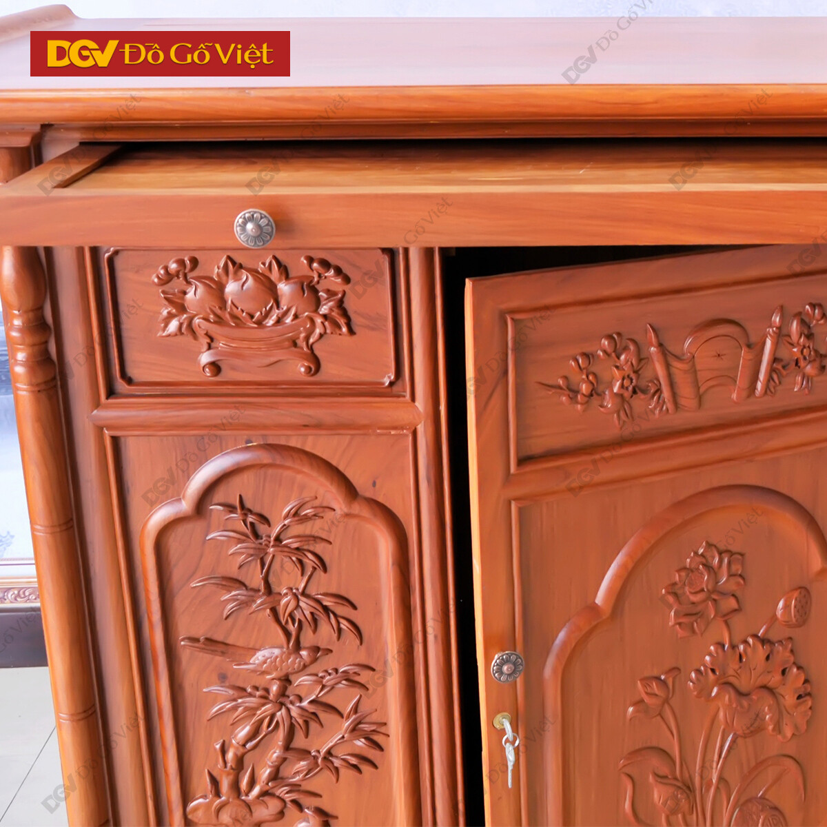 Tủ Thờ Gõ Đỏ Vuông Chạm Hoa Văn Đẹp Sang Trọng